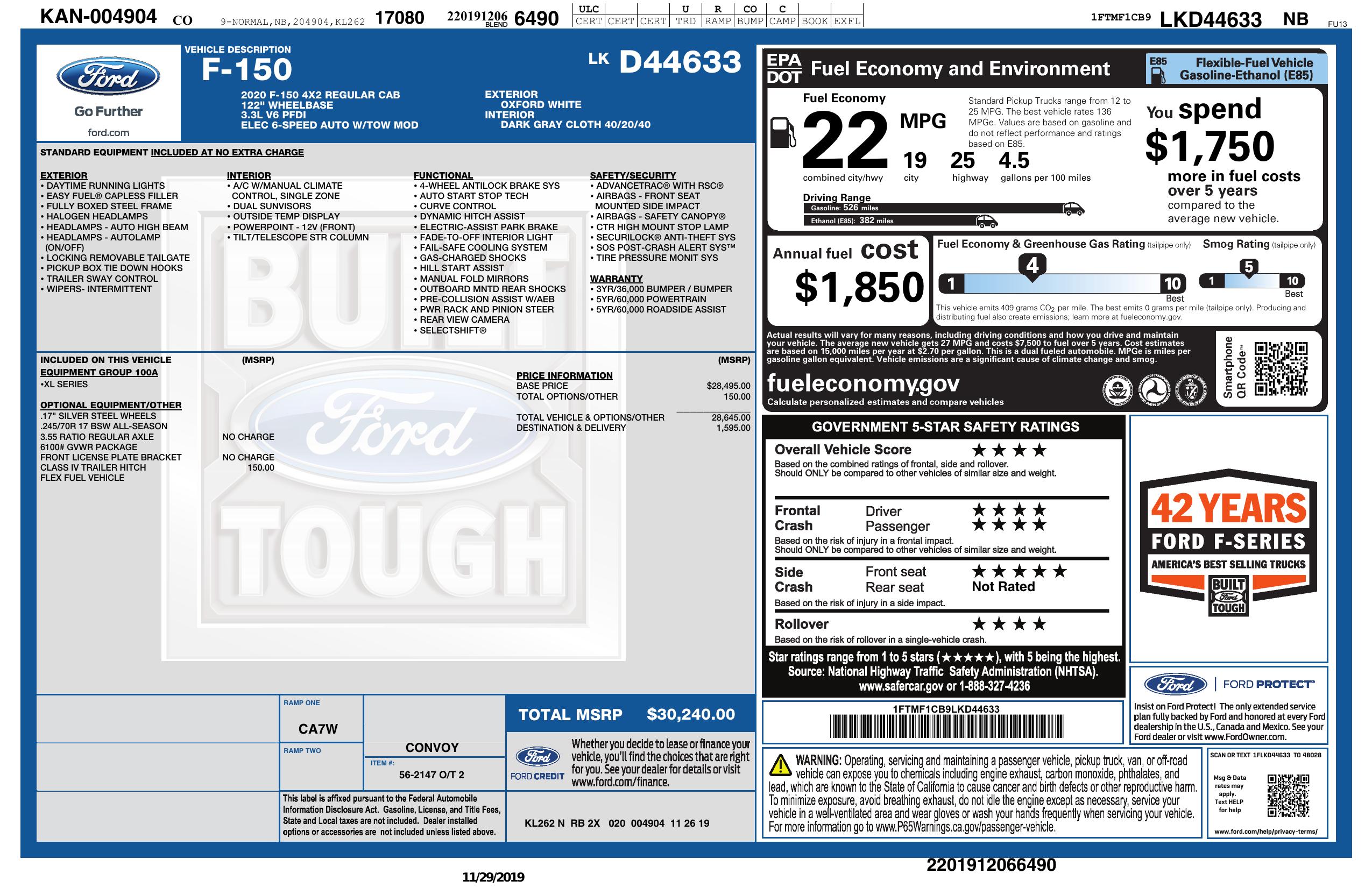 2020 Ford F 150 2 Wd Reg Cab Box