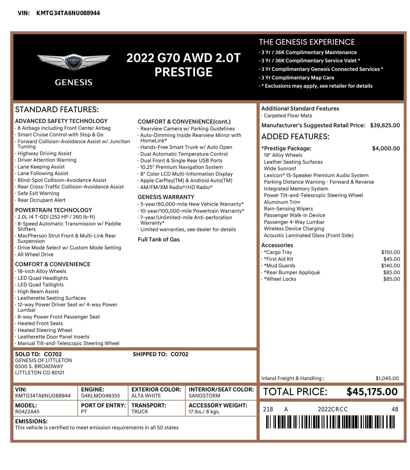 2022 Genesis G70 Awd 2.0 T 4dr Sedan