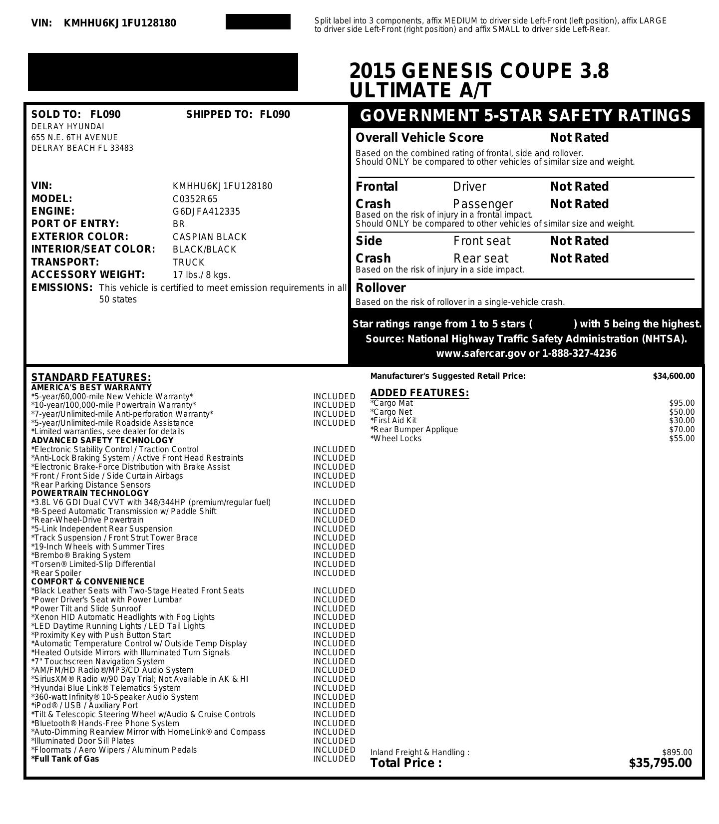 2015 Hyundai Genesis Coupe 2dr 3.8 L Auto Ultimate W/Black Seats