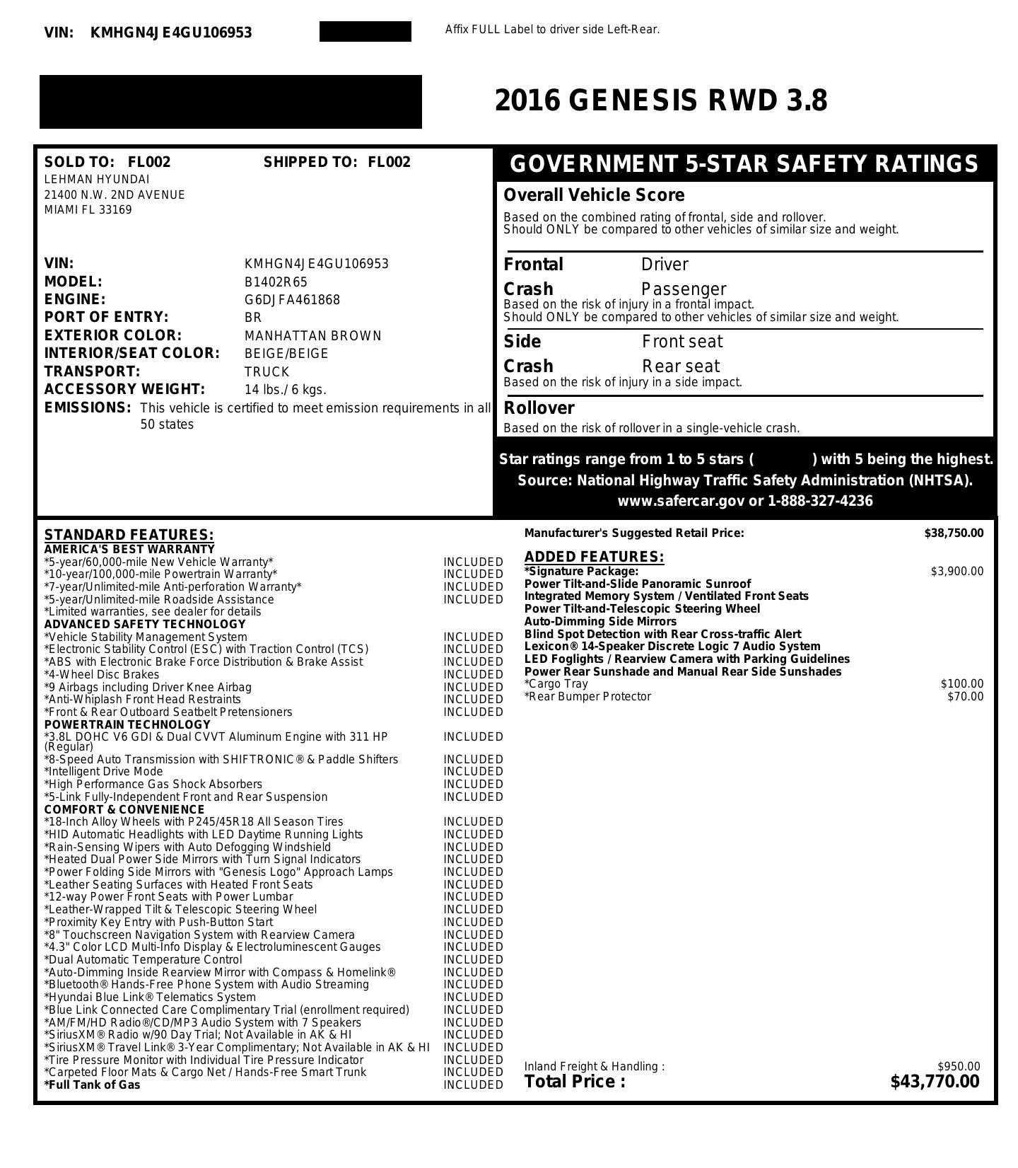 2016 Hyundai Genesis 4dr Sdn V6 3.8 L Rwd