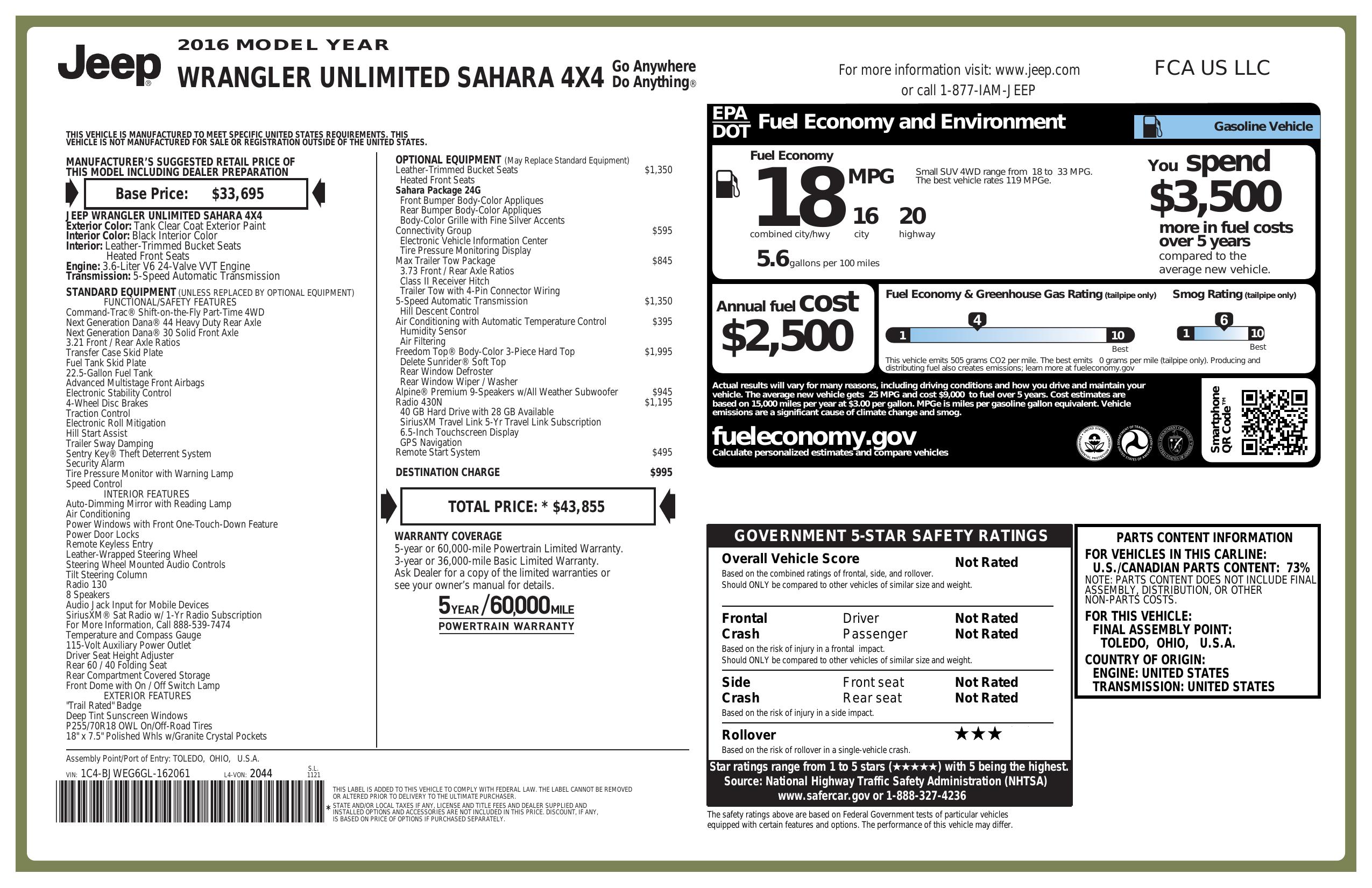 2016 Jeep Wrangler Unlimited 4 Wd 4dr Sahara