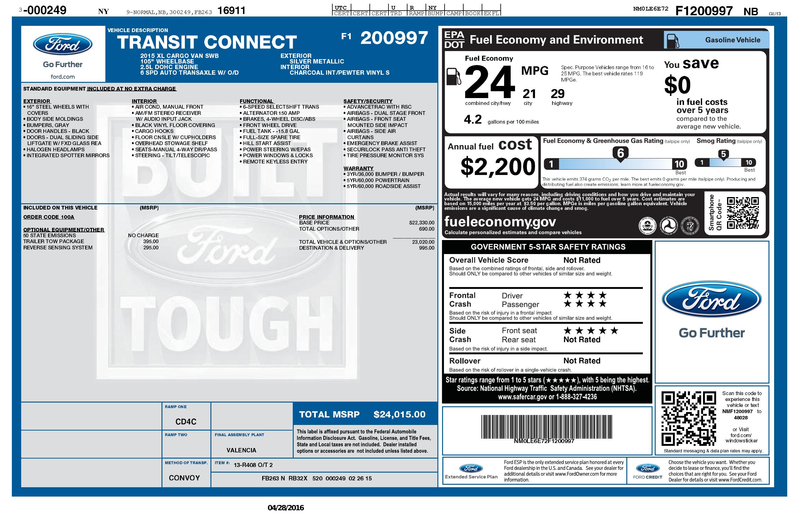 2015 Ford Transit Connect Swb Xl W/Rear Liftgate