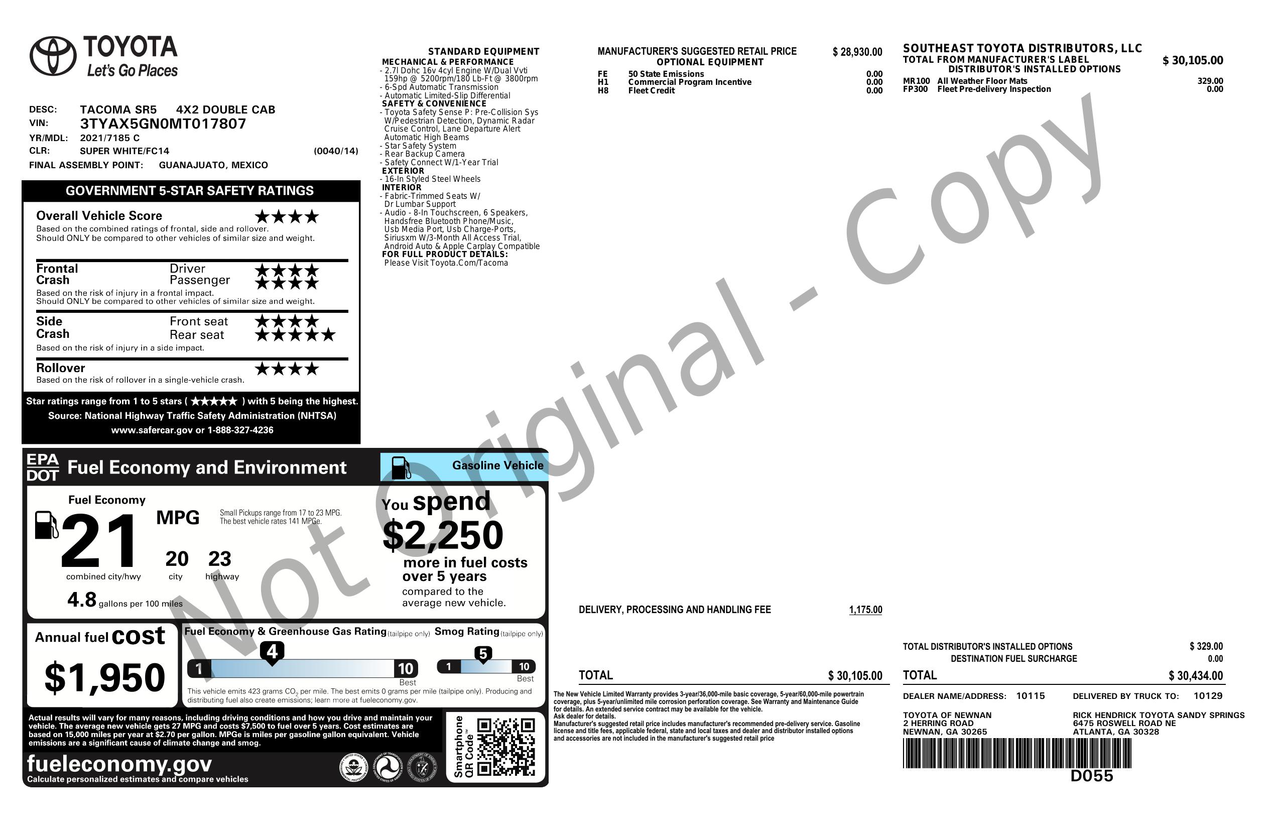 2021 Toyota Tacoma 2 Wd Double Cab 5' Bed I4 At (Natl)
