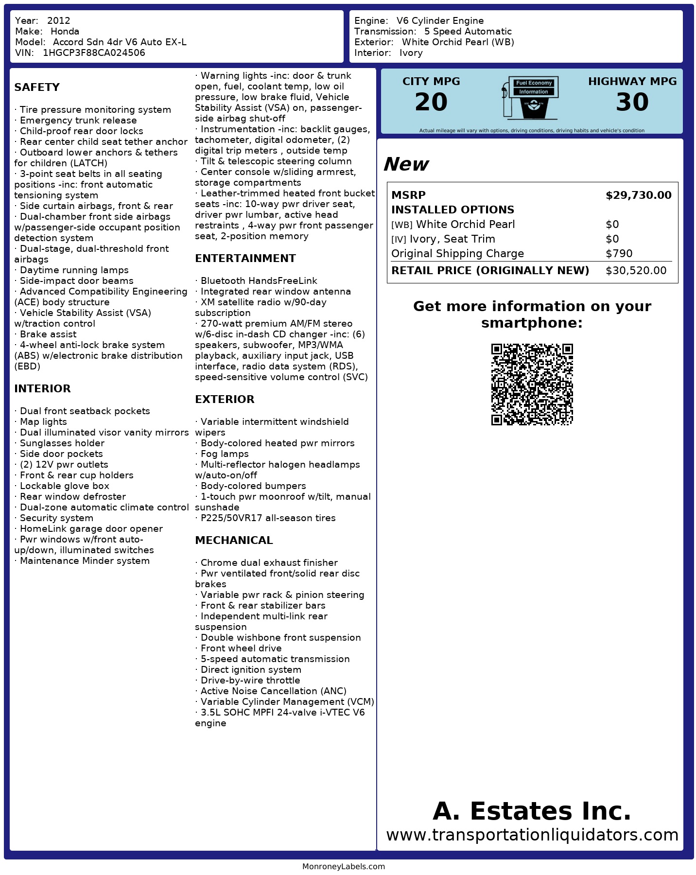 2012 Honda Accord Sdn 4dr V6 Auto Ex L