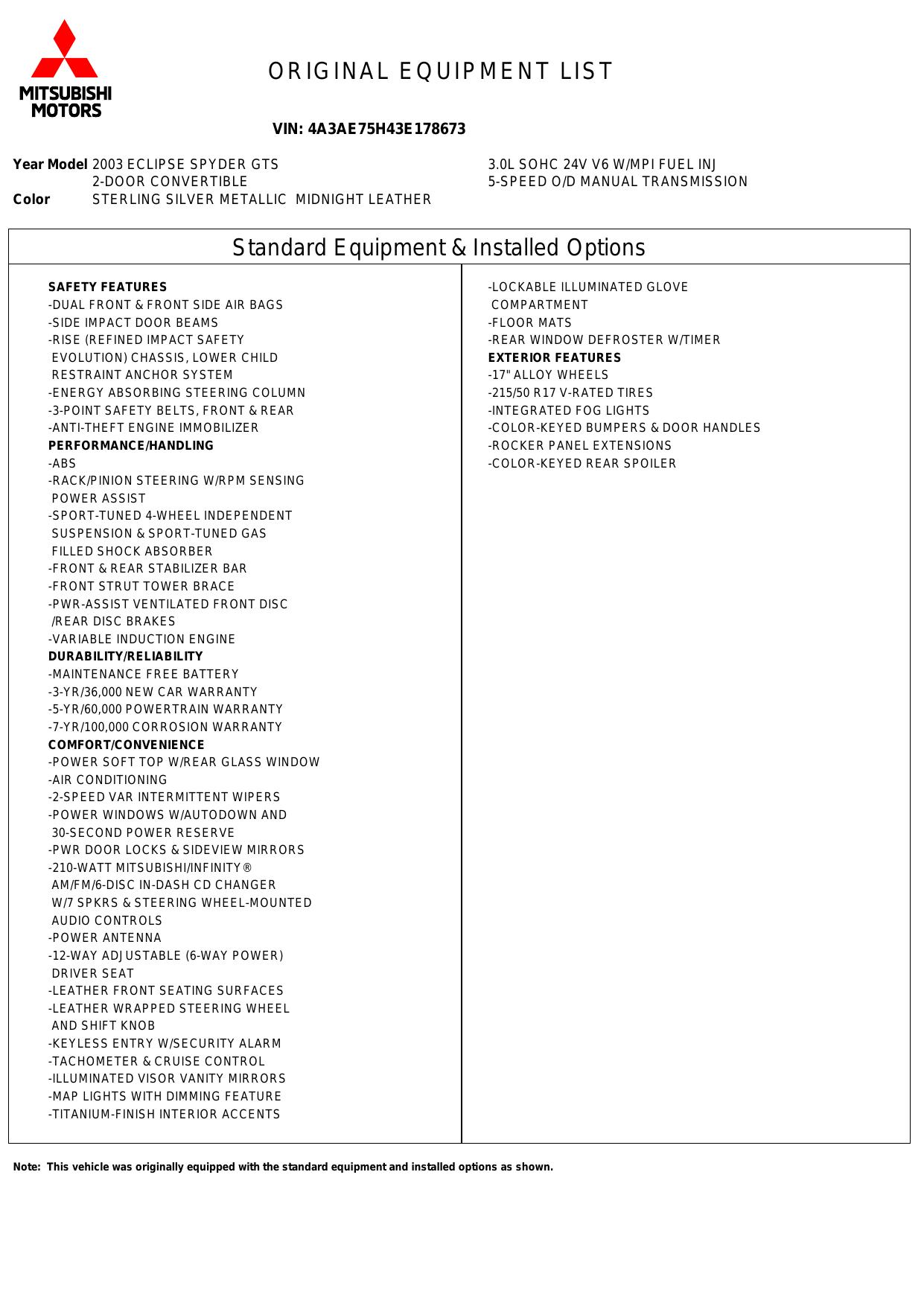 2003 Mitsubishi Eclipse 2dr Spyder Gts 3.0 L Manual