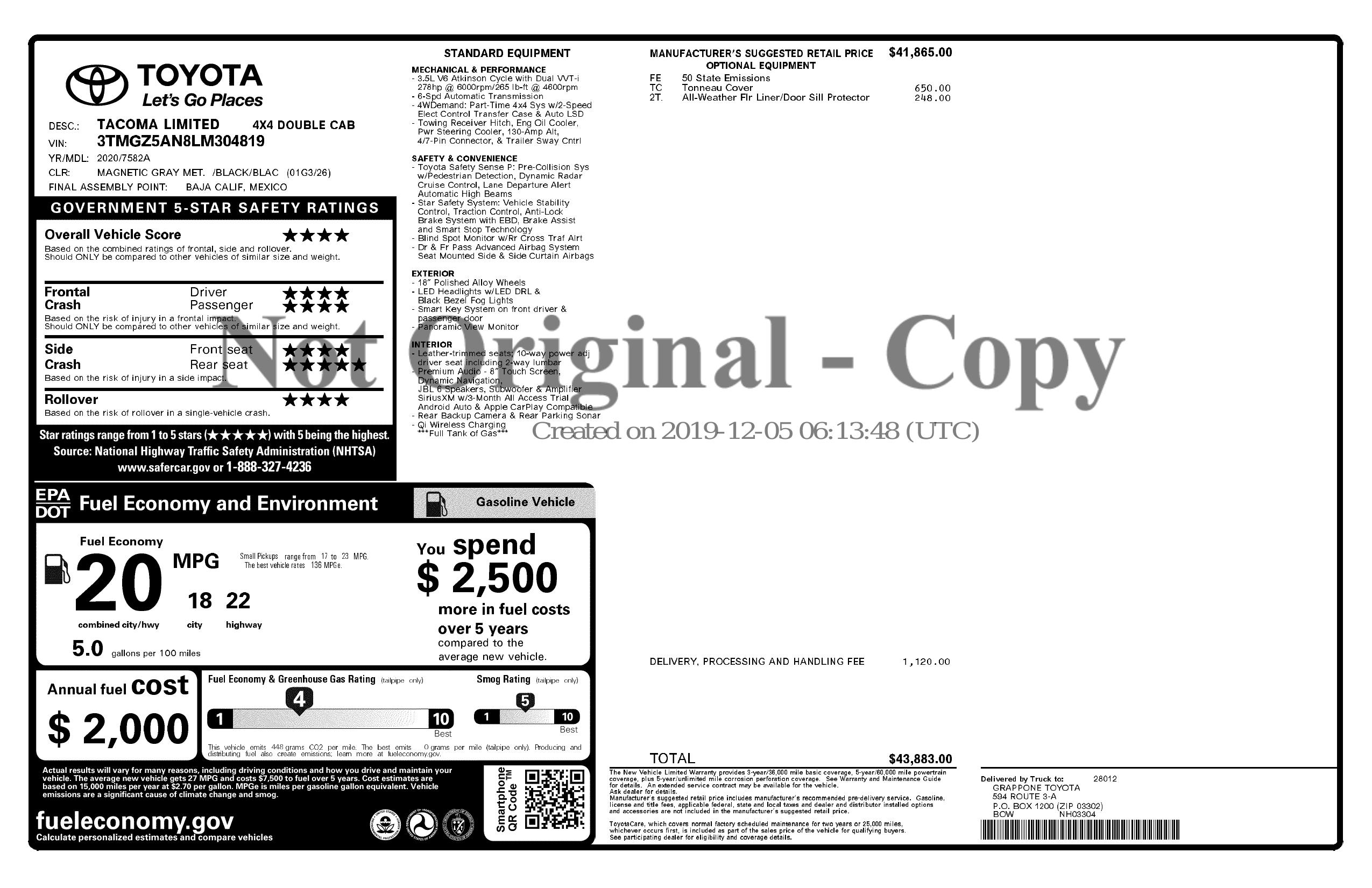 2020 Toyota Tacoma 4 Wd Limited Double Cab 5' Bed V6 At (Natl)