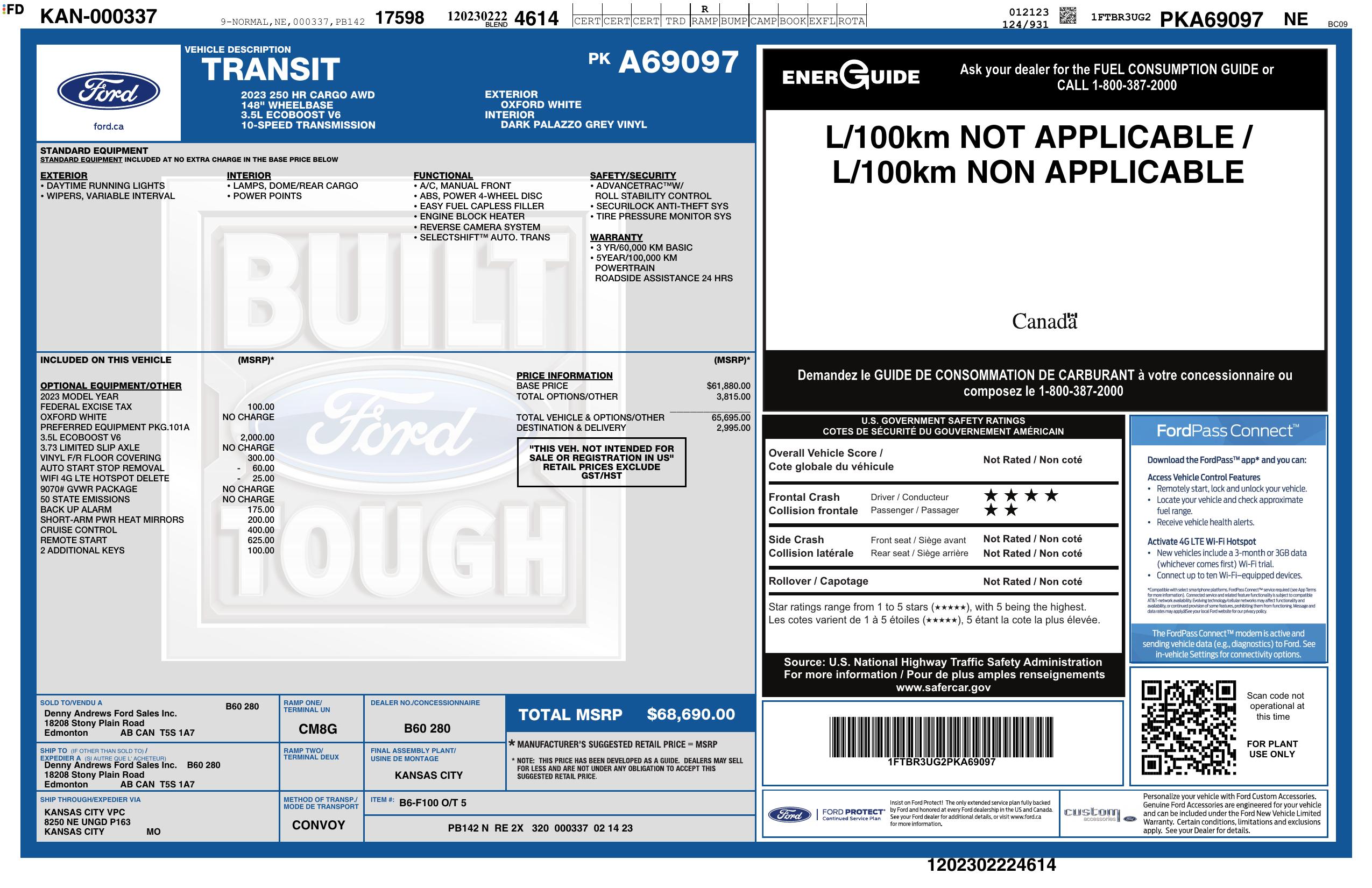 2023 Ford Transit Cargo Van T 250 148" El Hi Rf 9070 Gvwr Awd