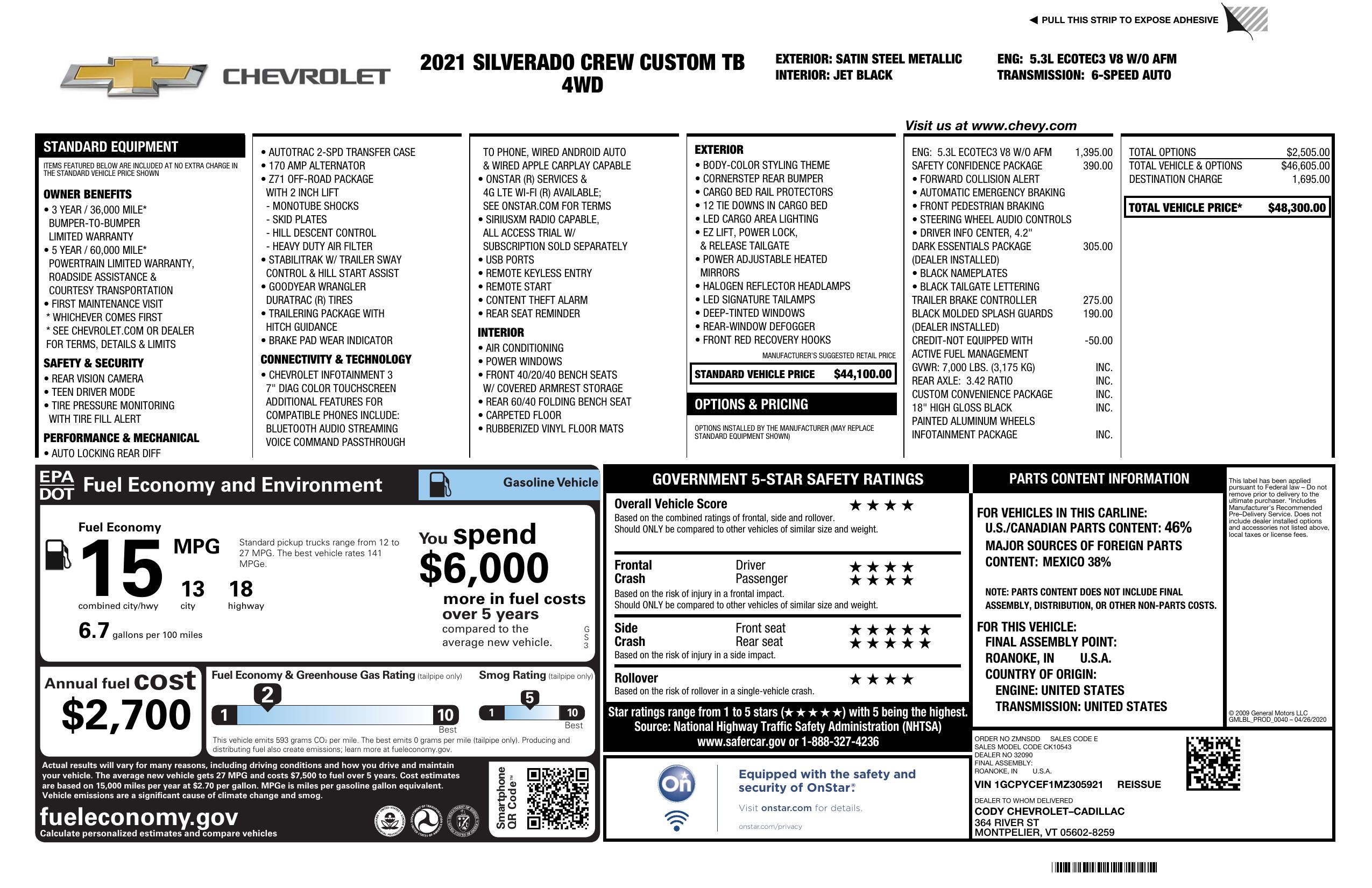2021 Chevrolet Silverado 1500 4 Wd Crew Cab 147" Custom Trail Boss