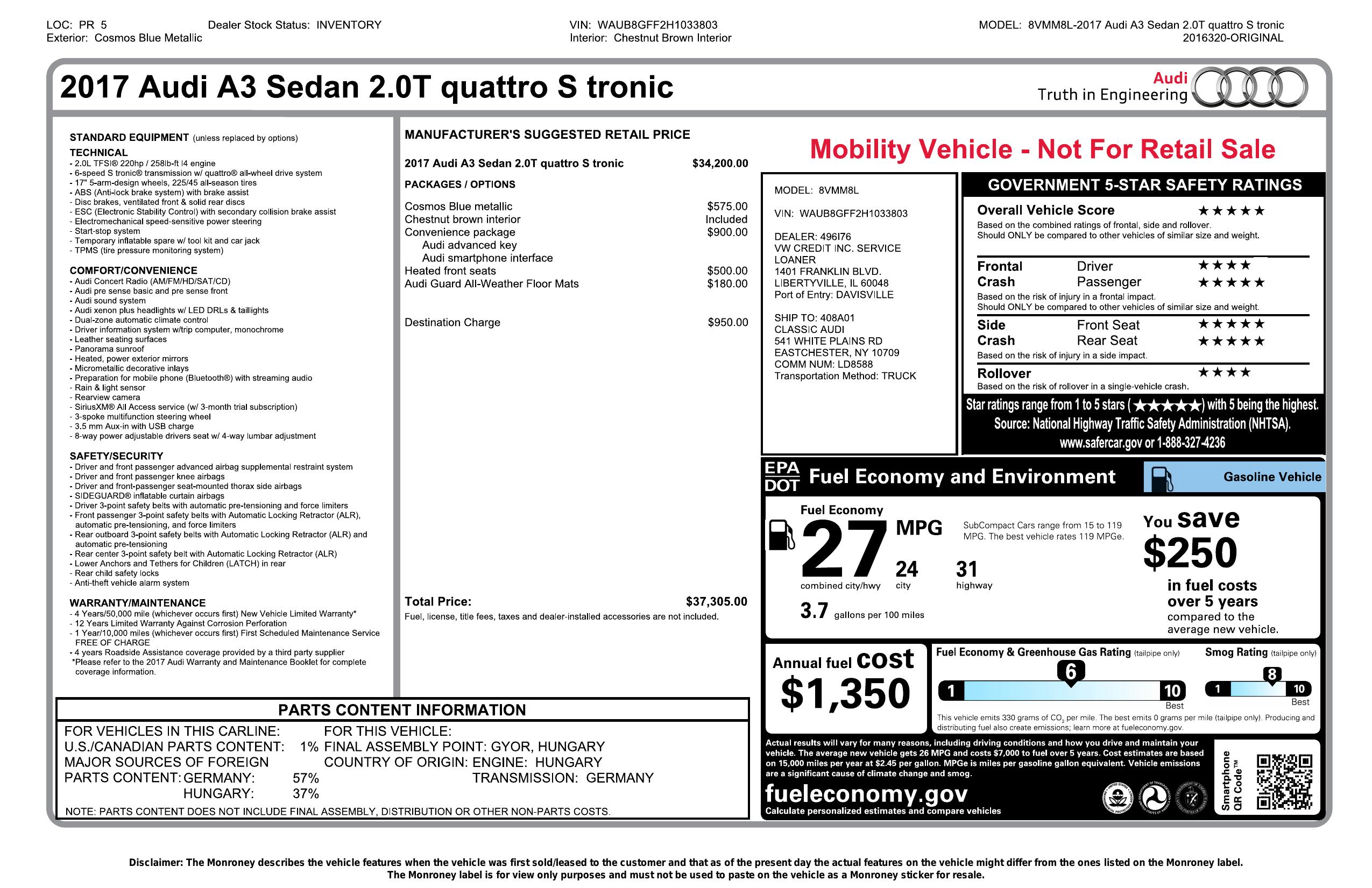 2017 Audi A3 Sedan 2.0 Tfsi Premium Quattro Awd
