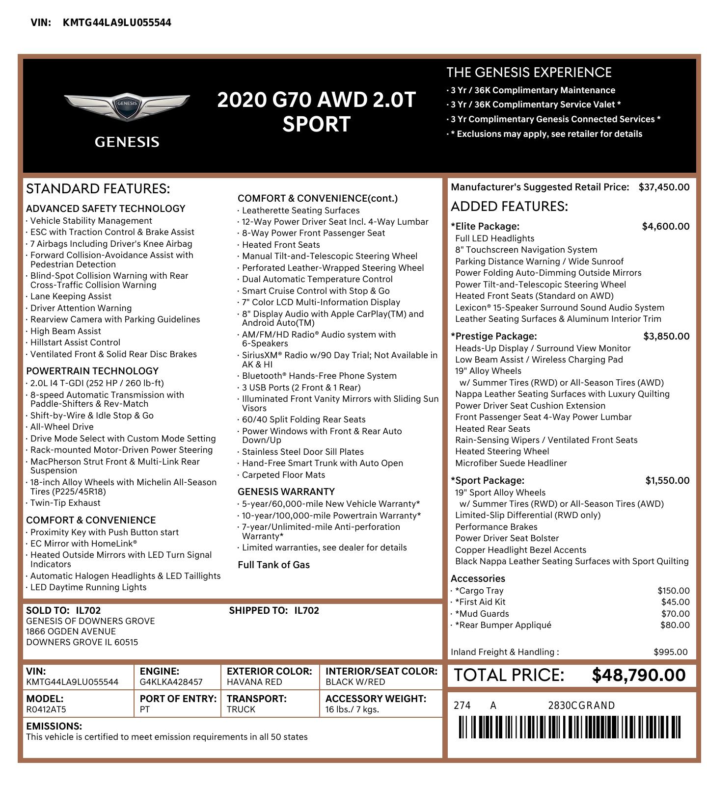2020 Genesis G70 Awd 2.0 T 4dr Sedan