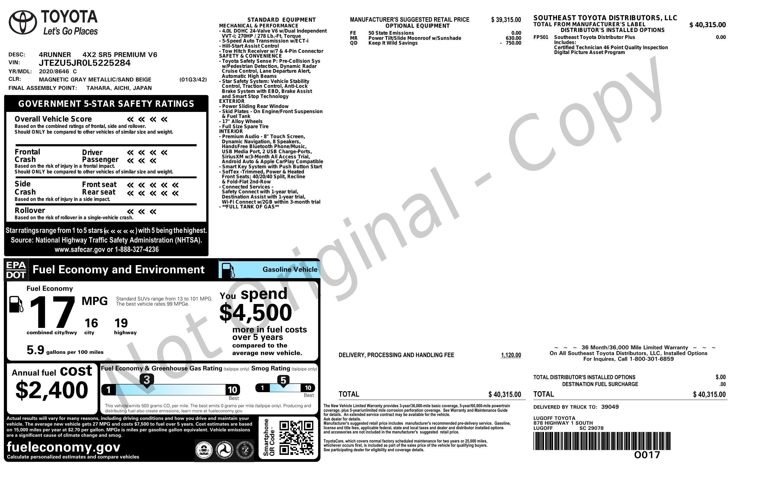 2020 Toyota 4 Runner 2 Wd (Natl)