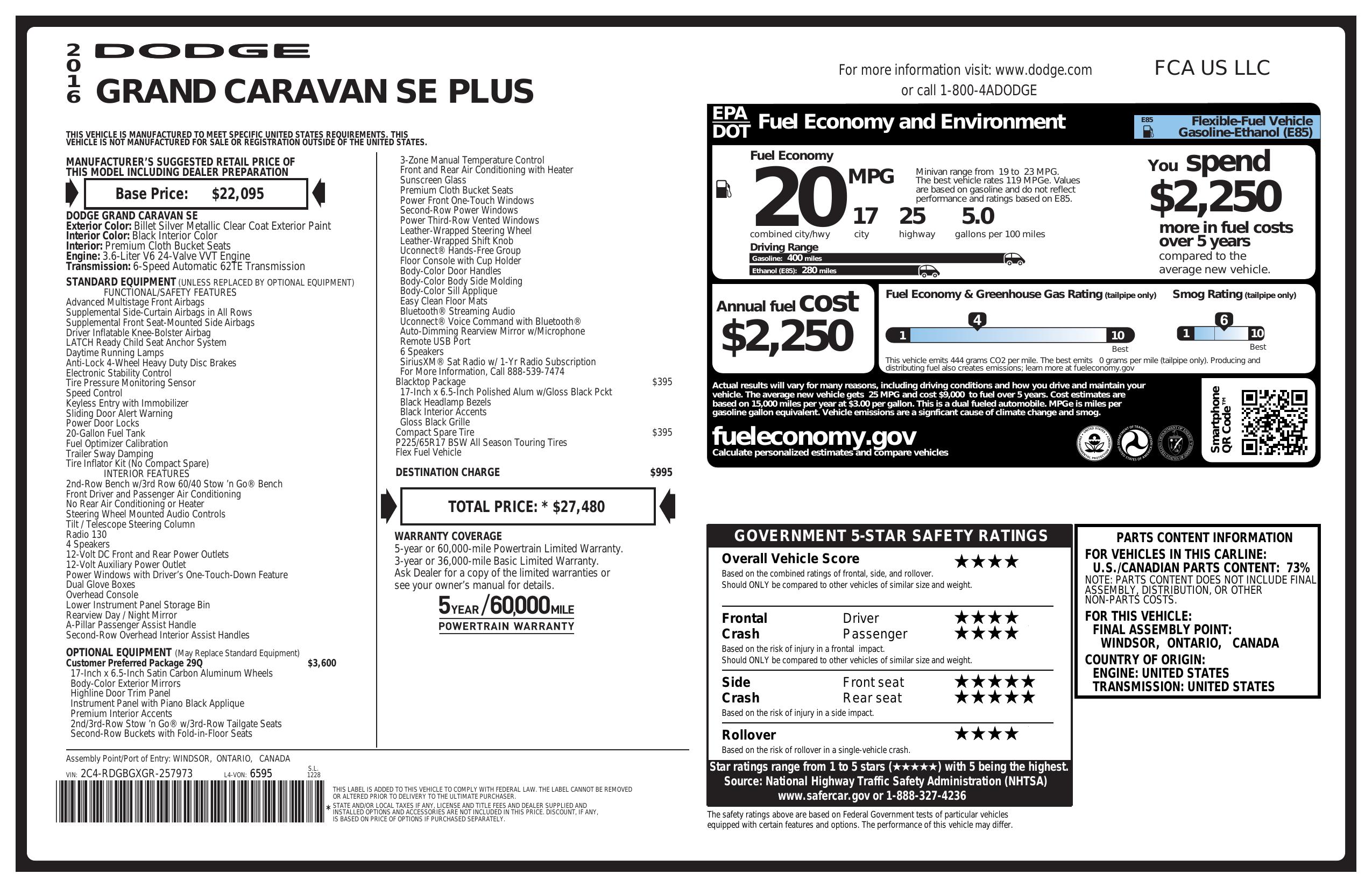 2016 Dodge Grand Caravan 4dr Wgn Se Plus