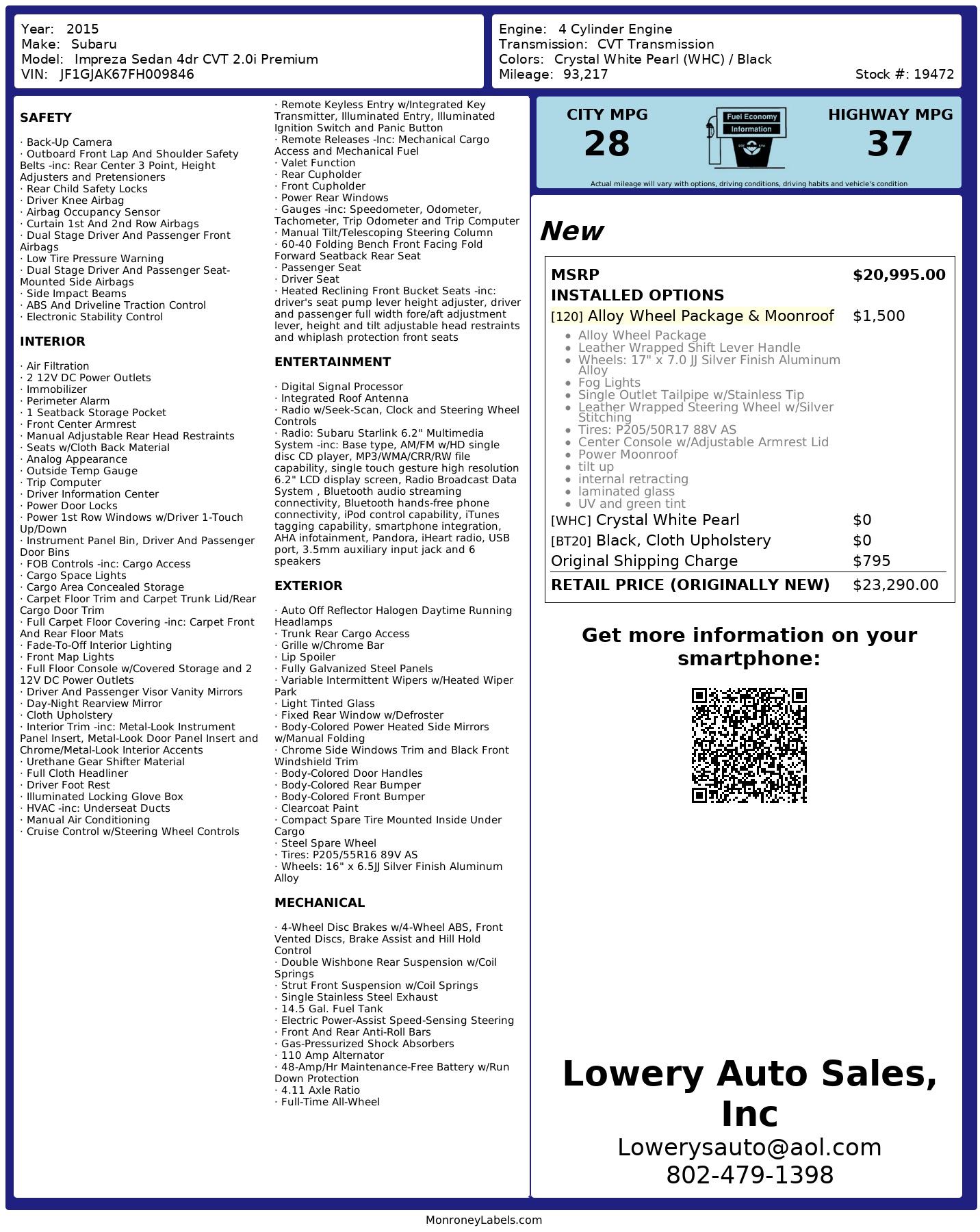 2015 Subaru Impreza Sedan 4dr Cvt 2.0i Premium