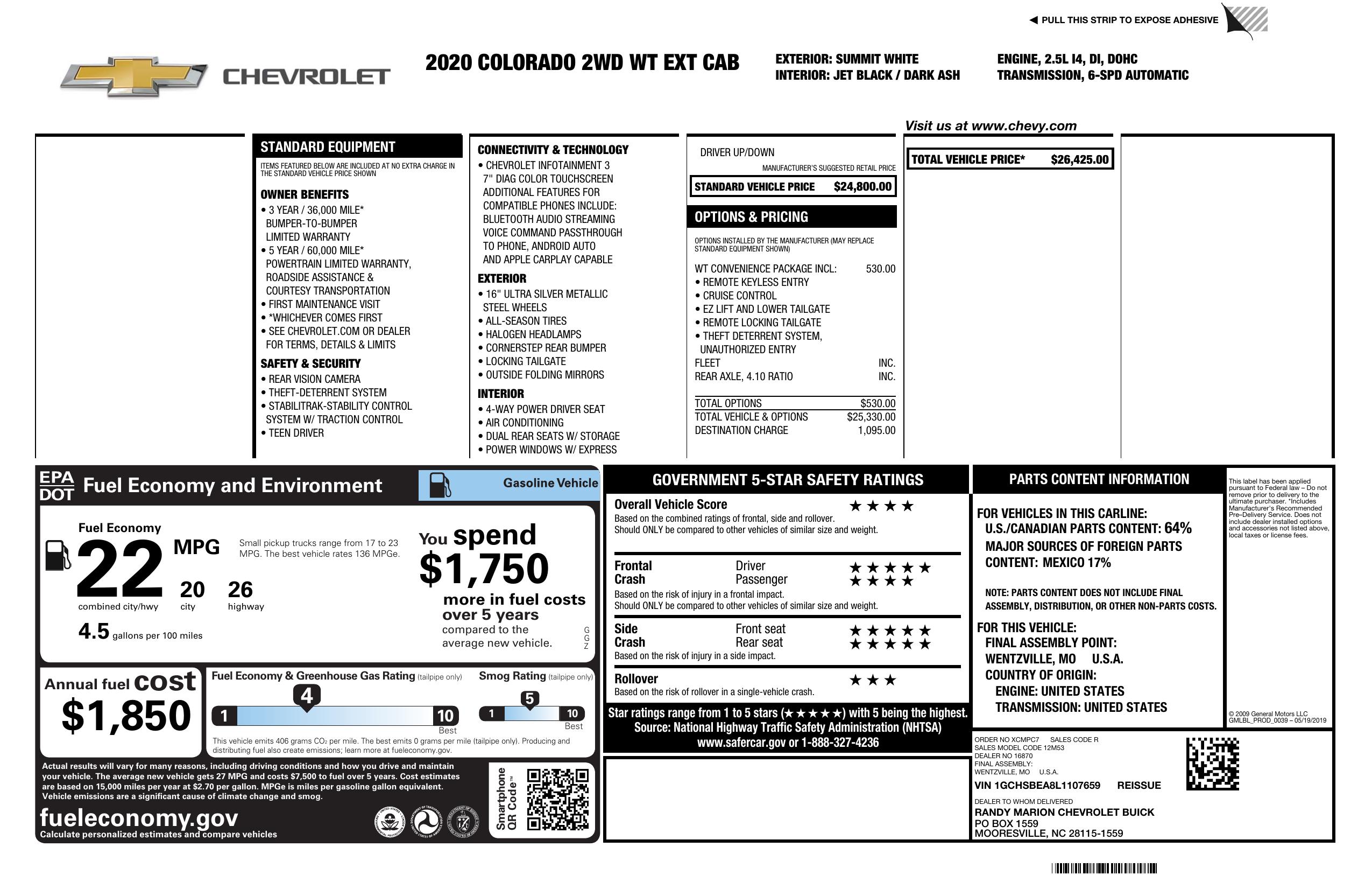2020 Chevrolet Colorado 2 Wd Ext Cab 128" Work Truck