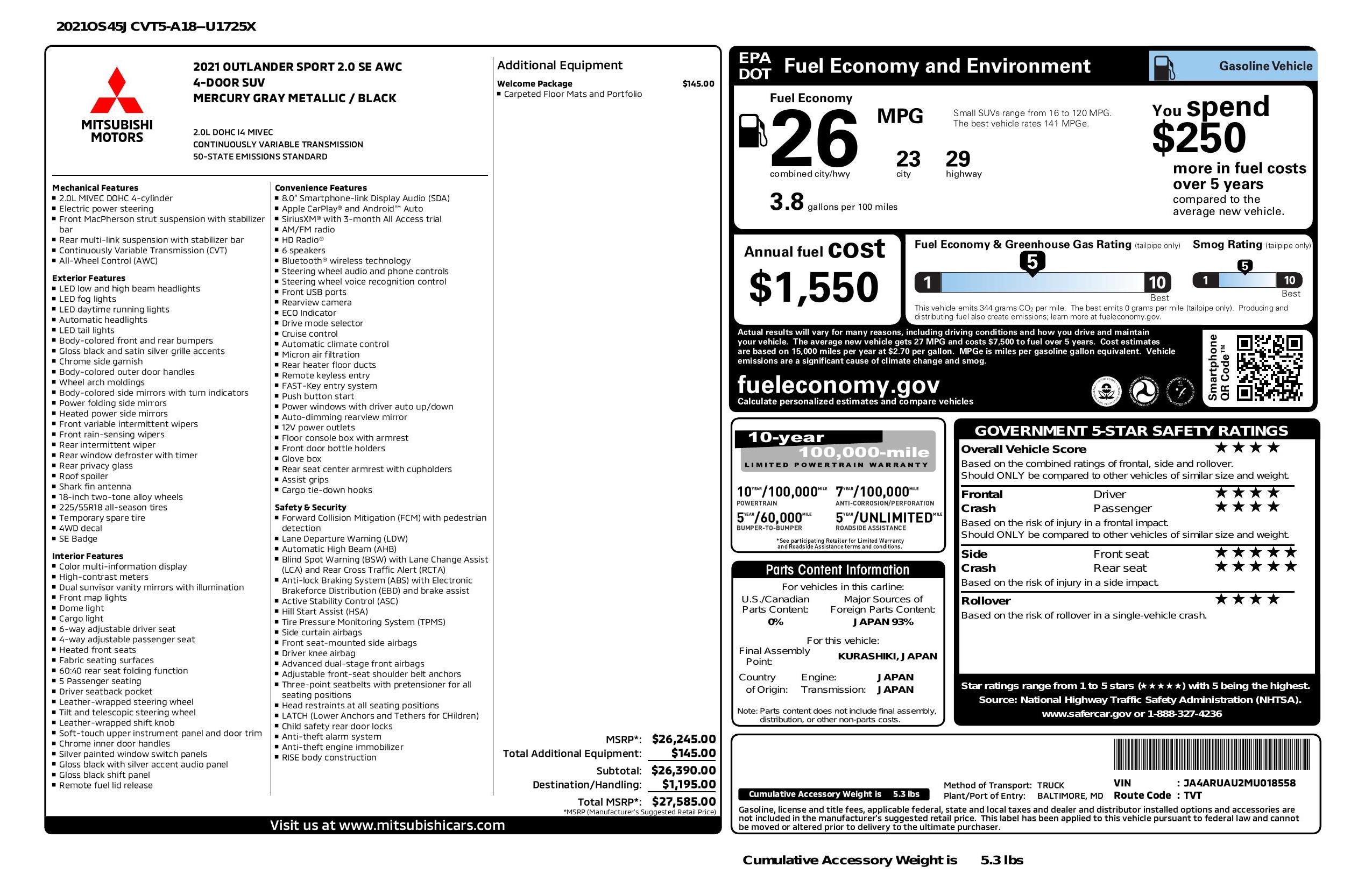 2021 Mitsubishi Outlander Sport 2.0 Awc Cvt