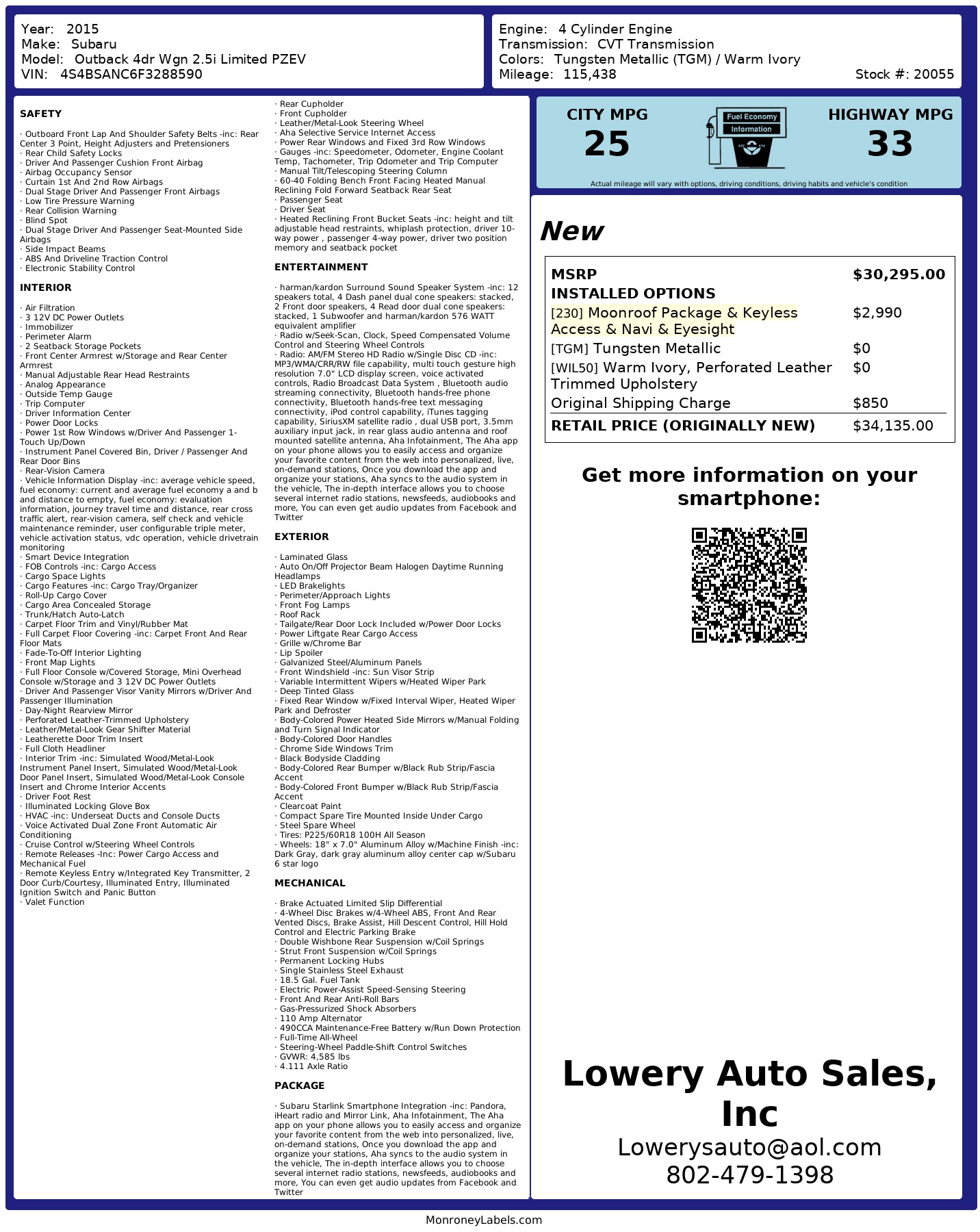 2015 Subaru Outback 4dr Wgn 2.5i Limited Pzev