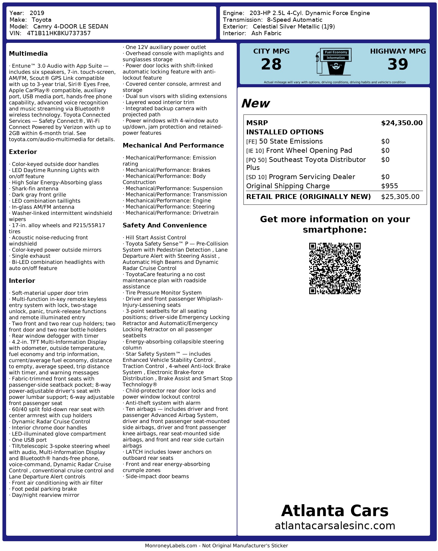 2019 Toyota Camry 4 Door Le Sedan