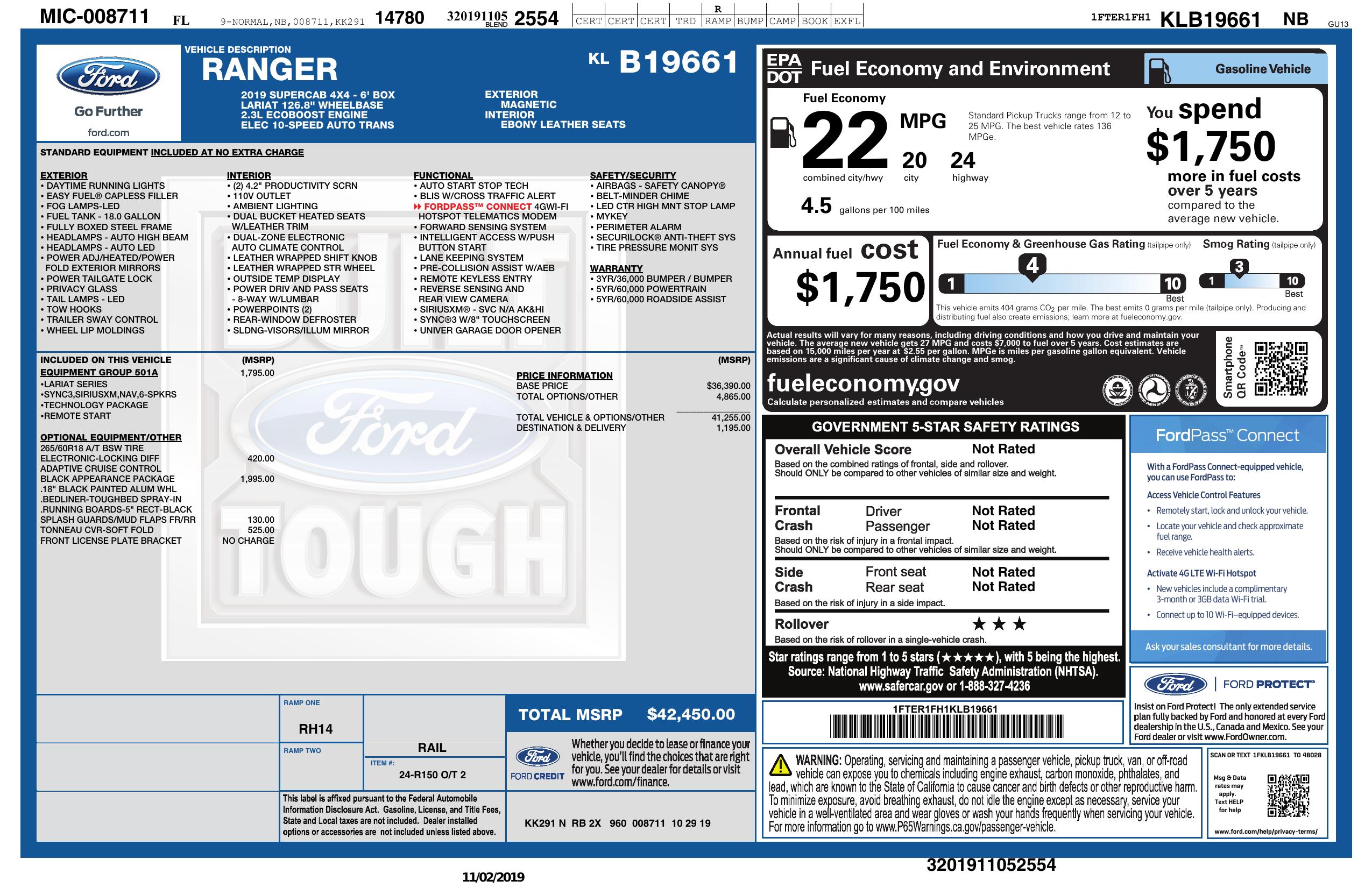 2019 Ford Ranger 4 Wd Super Cab 6' Box