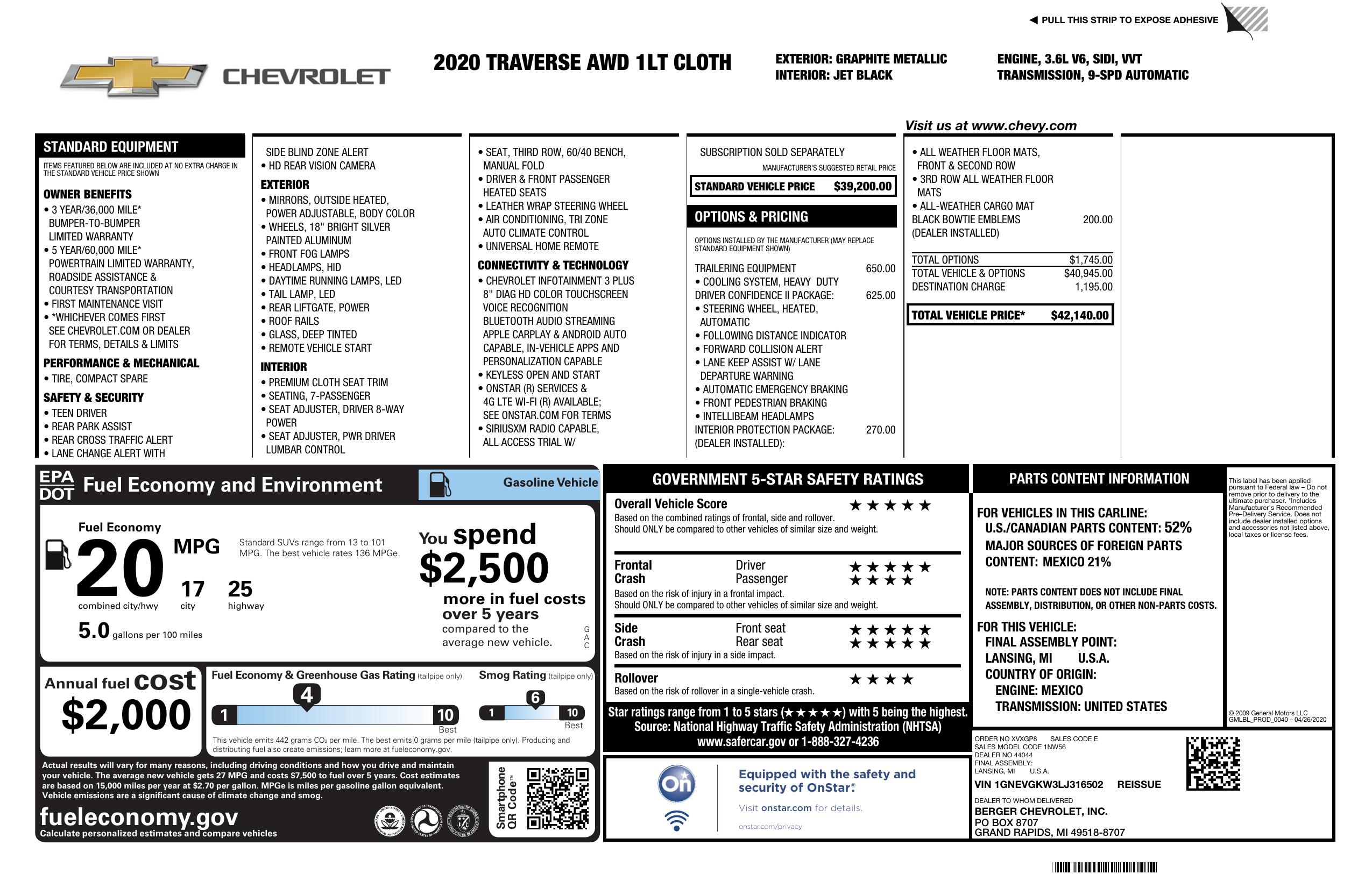 2020 Chevrolet Traverse Awd 4dr Lt Cloth W/1 Lt