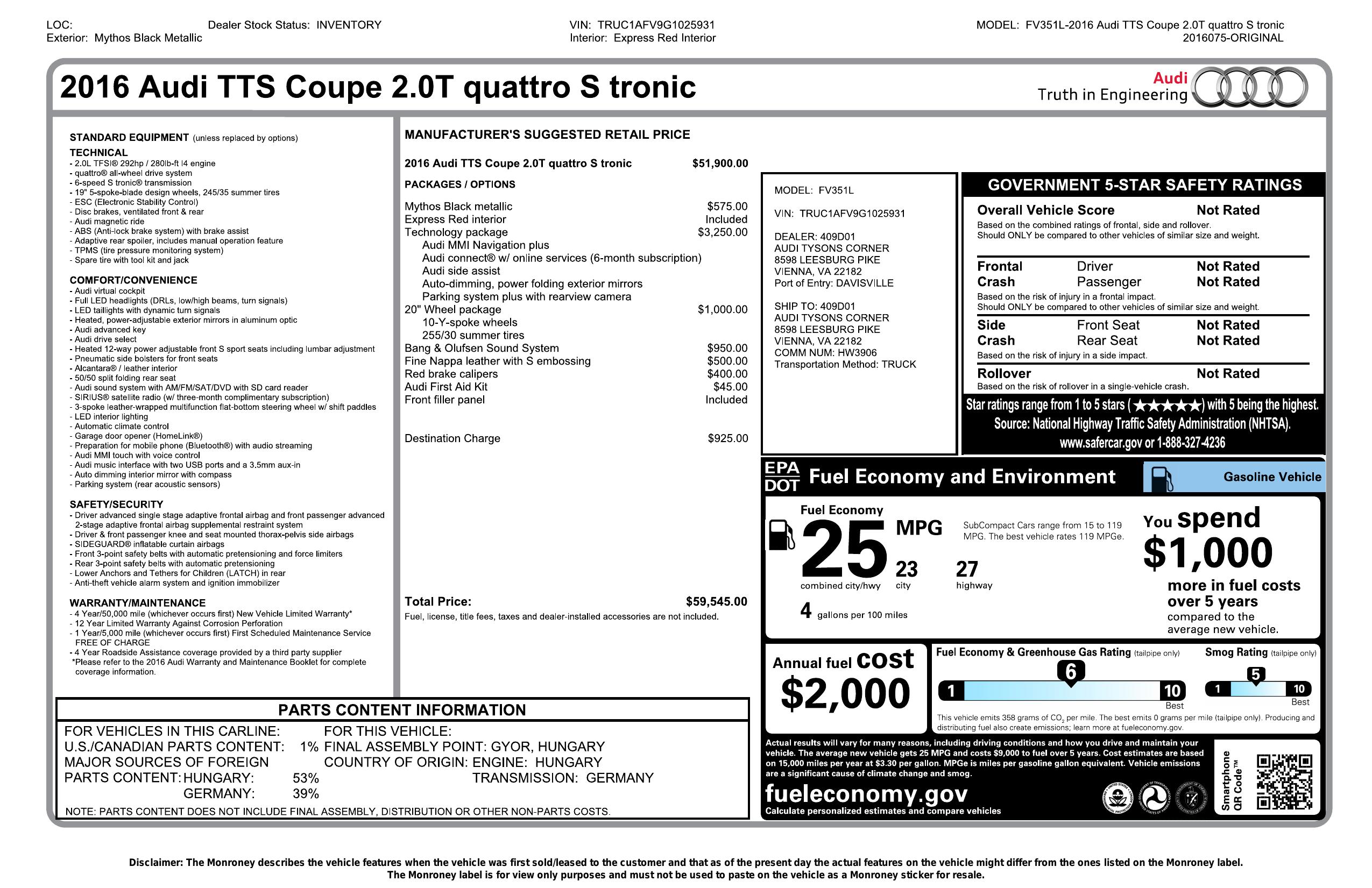 2016 Audi Tts 2dr Cpe S Tronic Quattro 2.0 T