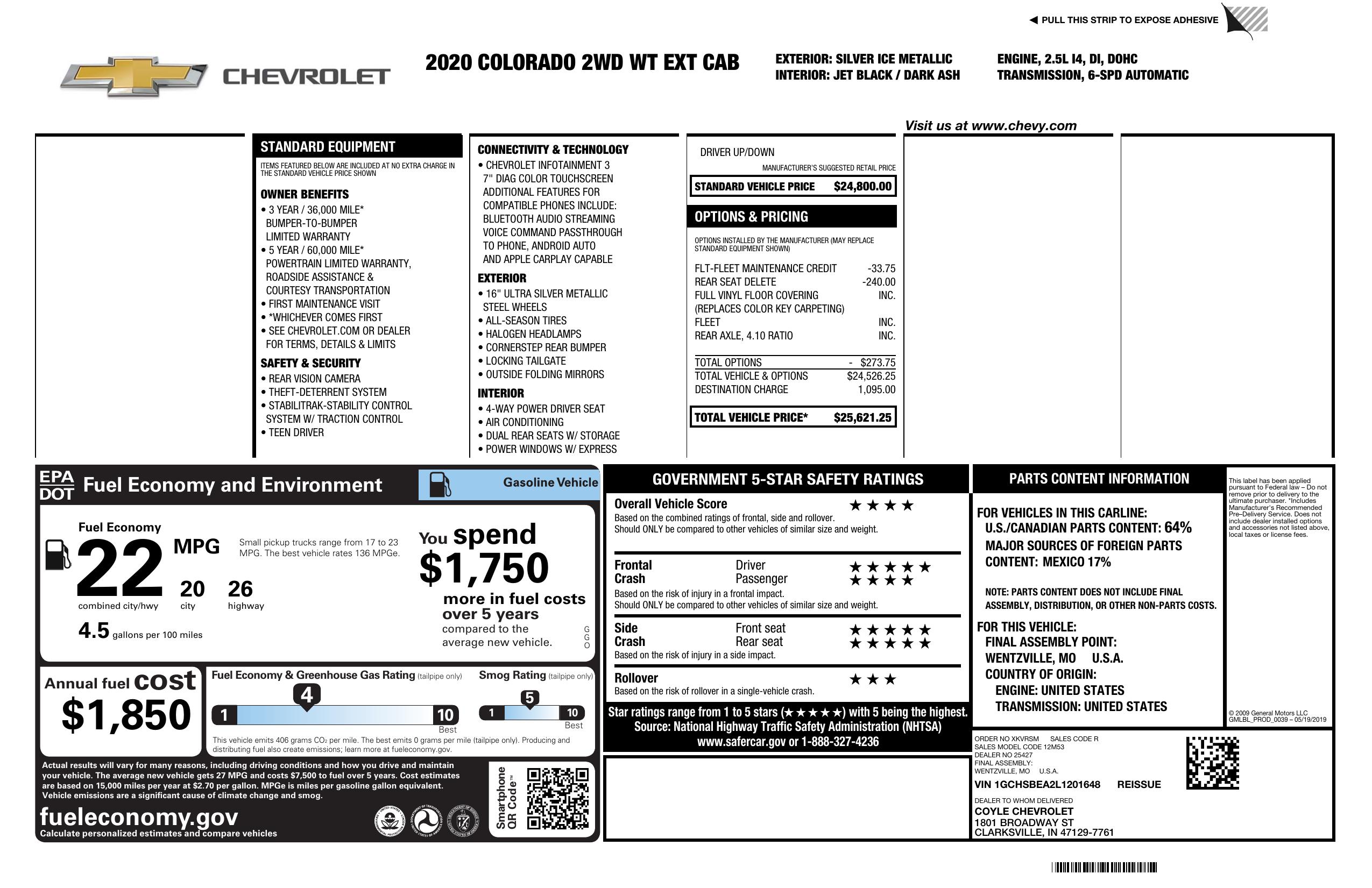 2020 Chevrolet Colorado 2 Wd Ext Cab 128" Work Truck
