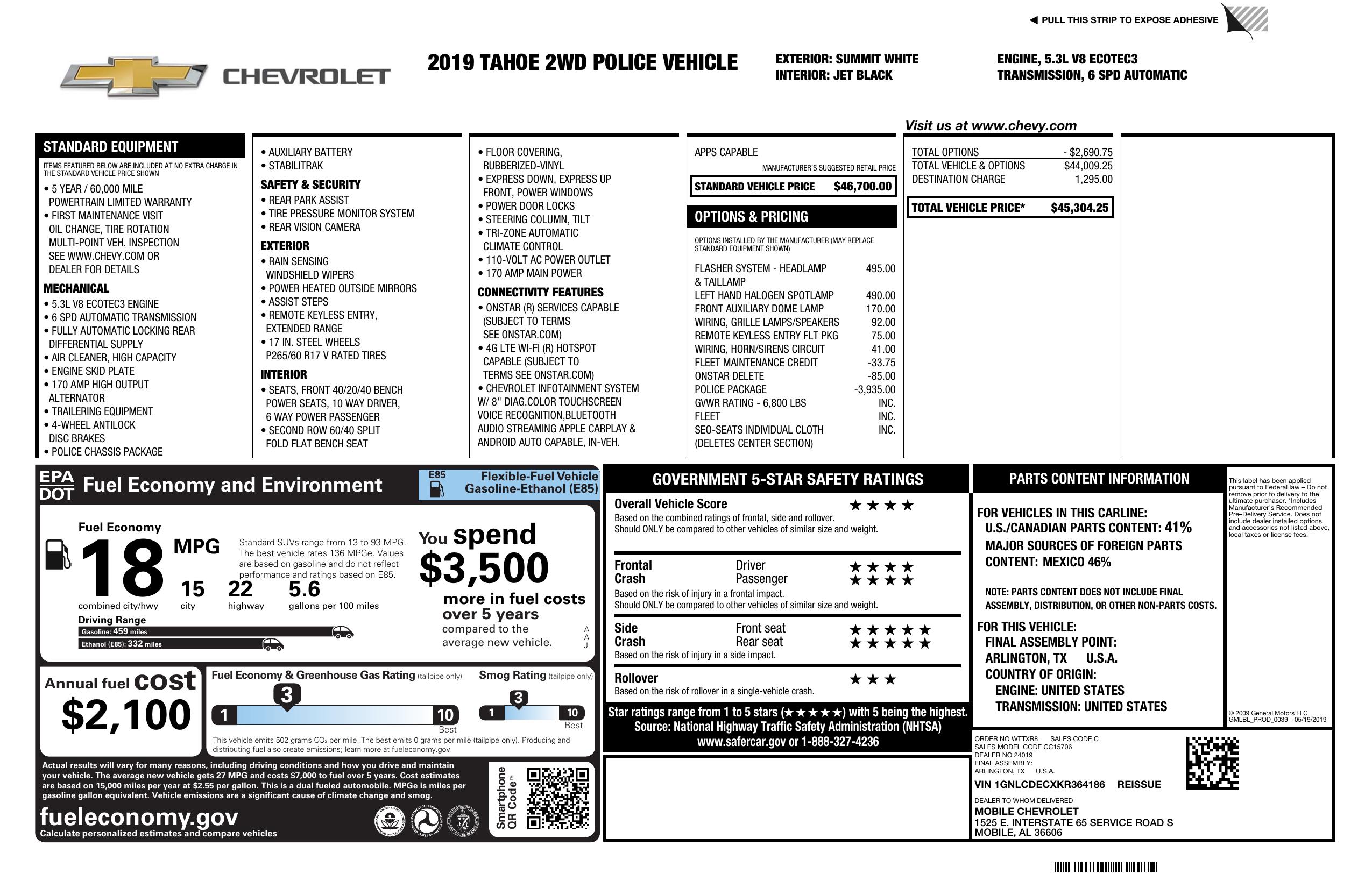 2019 Chevrolet Tahoe 2 Wd 4dr Commercial