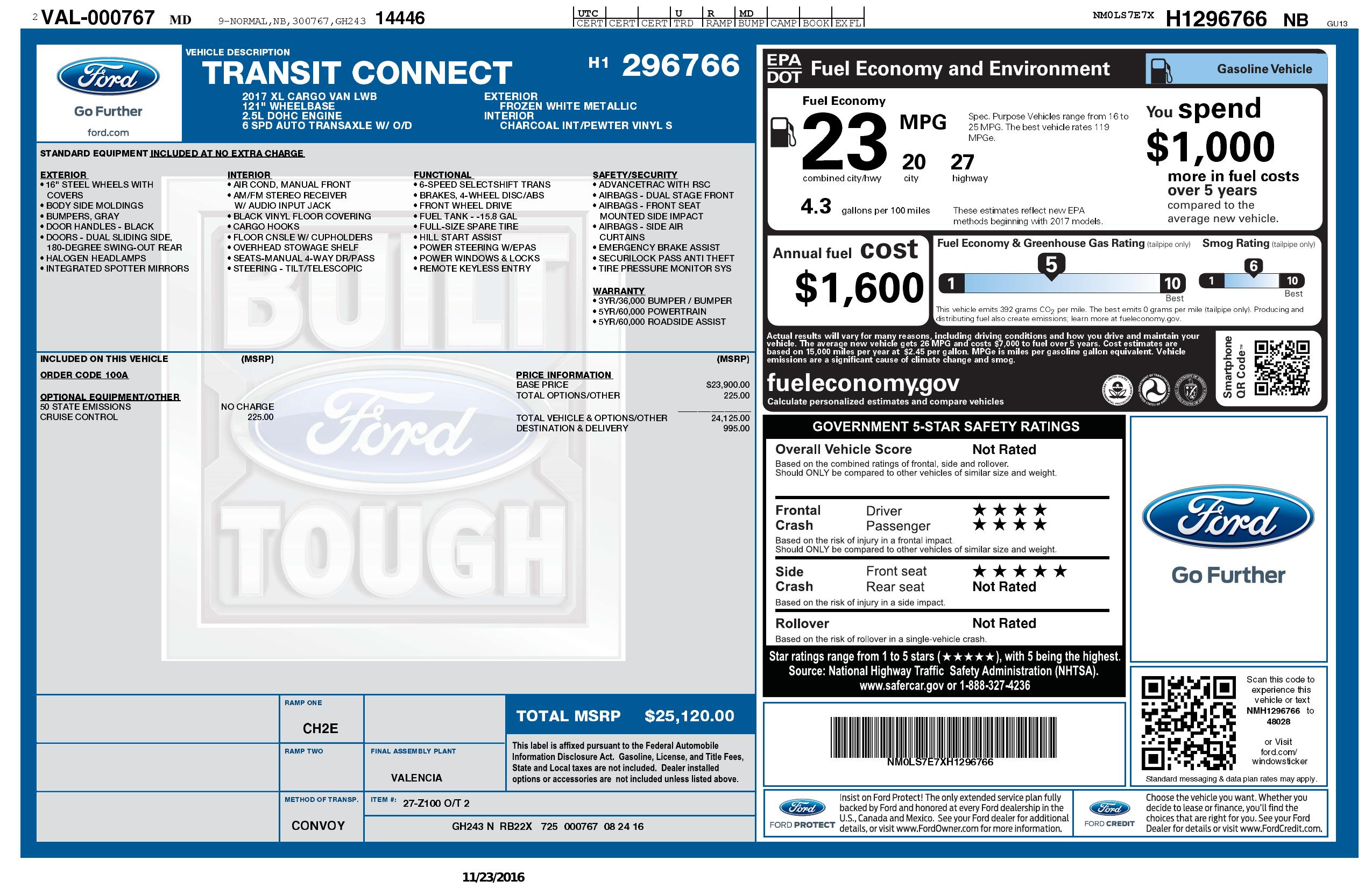 2017 Ford Transit Connect Van Xl Lwb W/Rear Symmetrical Doors
