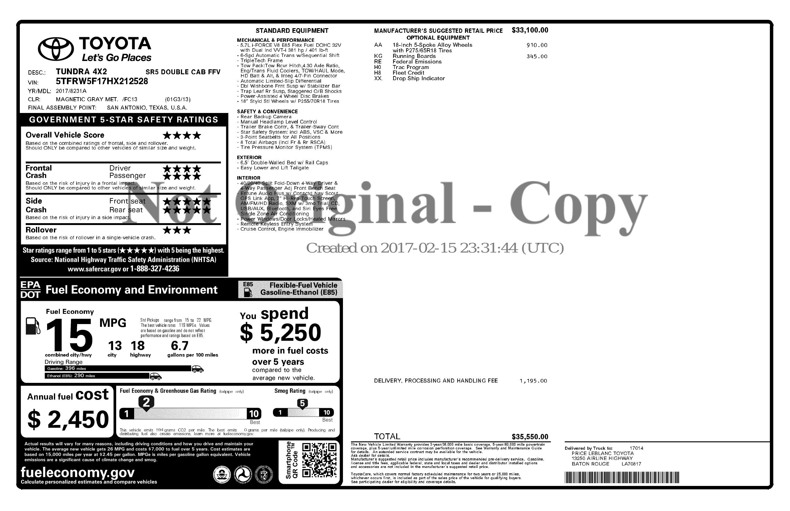 2017 Toyota Tundra 2 Wd Double Cab 6.5' Bed 5.7 L Ffv (Natl)
