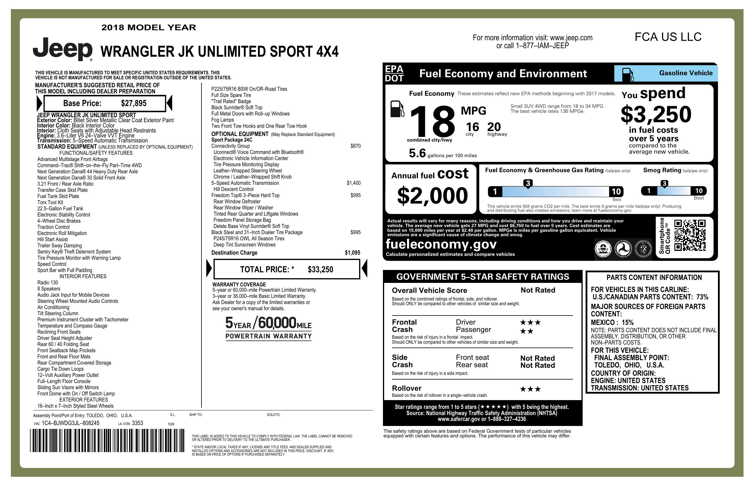 2018 Jeep Wrangler Jk Unlimited Sport 4x4