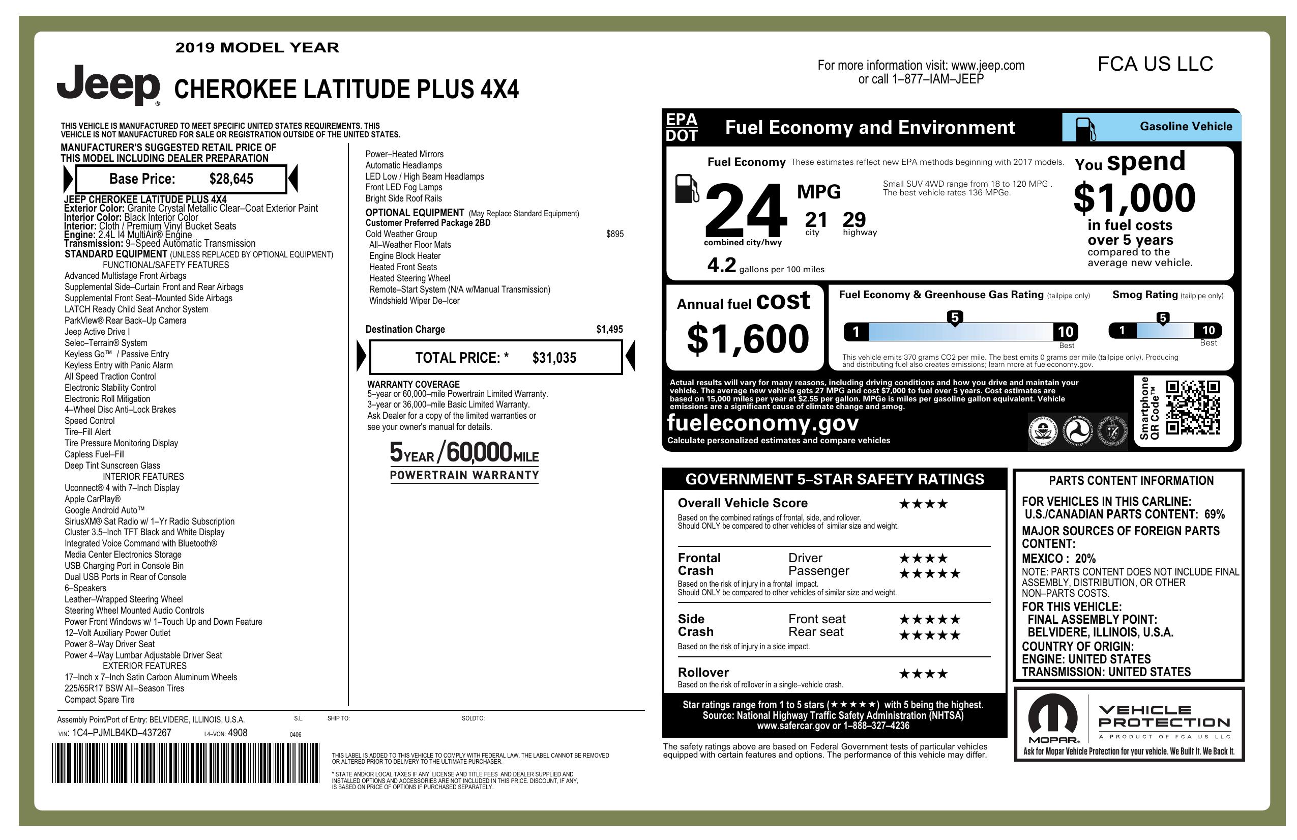 2019 Jeep Cherokee Latitude Plus 4 Wd