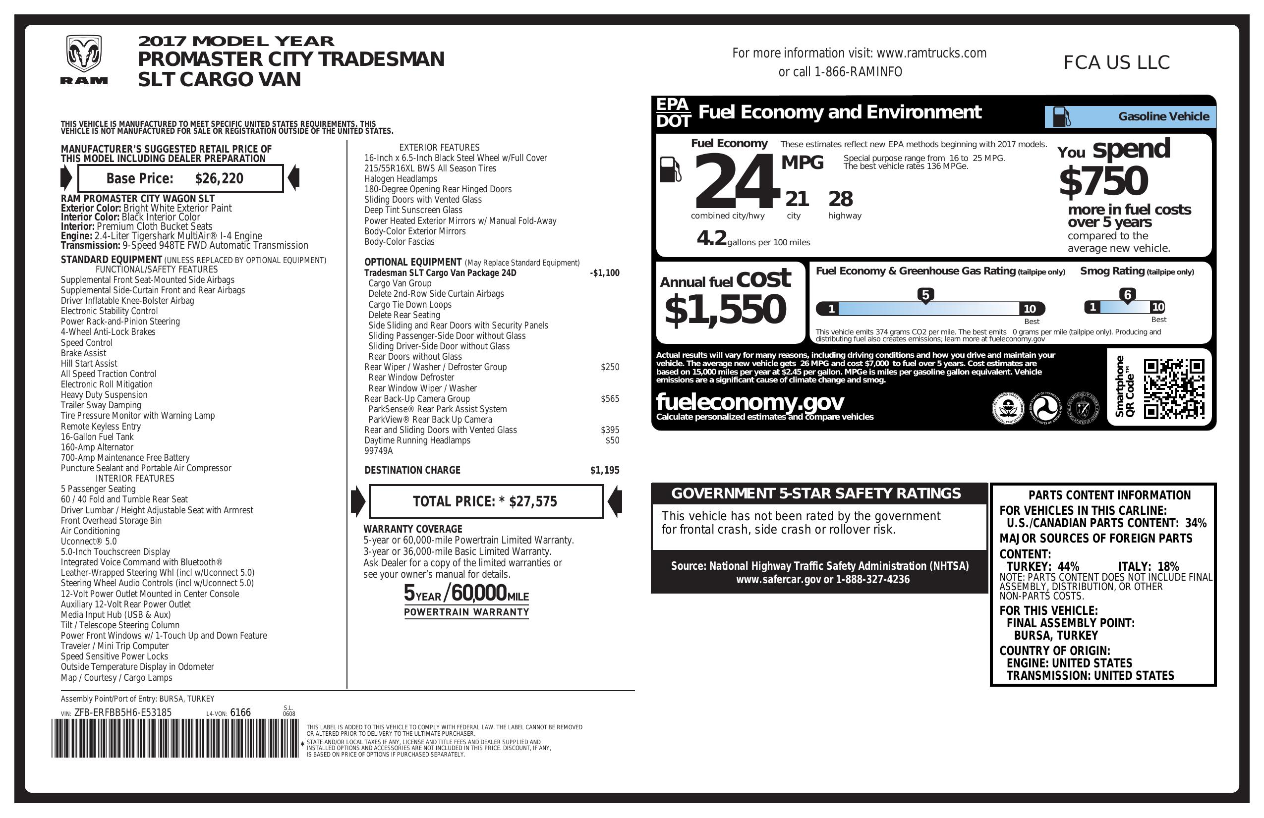 2017 Ram Pro Master City Cargo Van Tradesman Slt Van