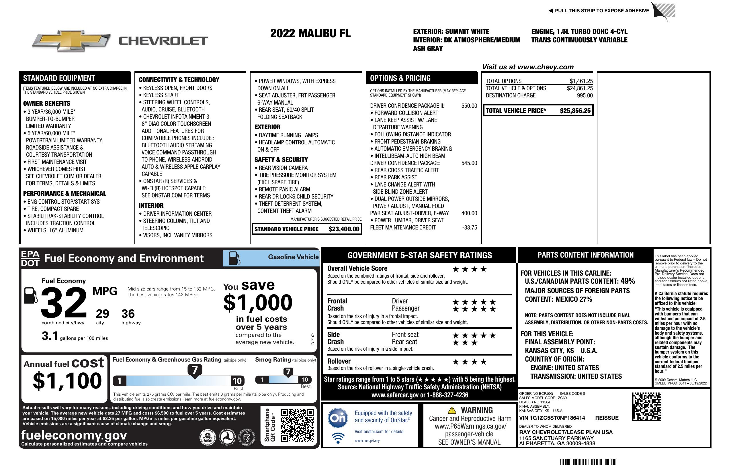 2022 Chevrolet Malibu 4dr Sdn Ls W/1 Fl