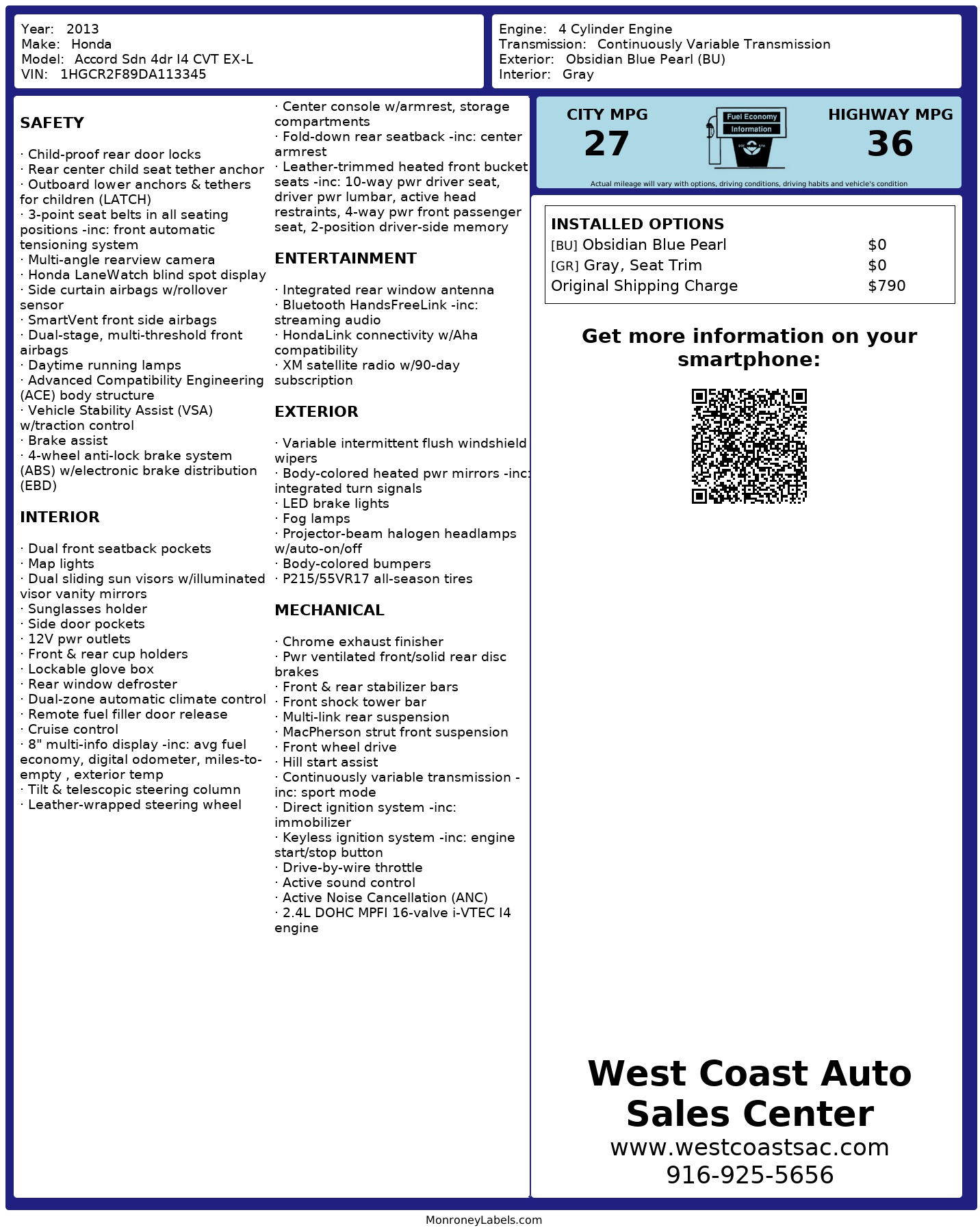 2013 Honda Accord Sdn 4dr I4 Cvt Ex L