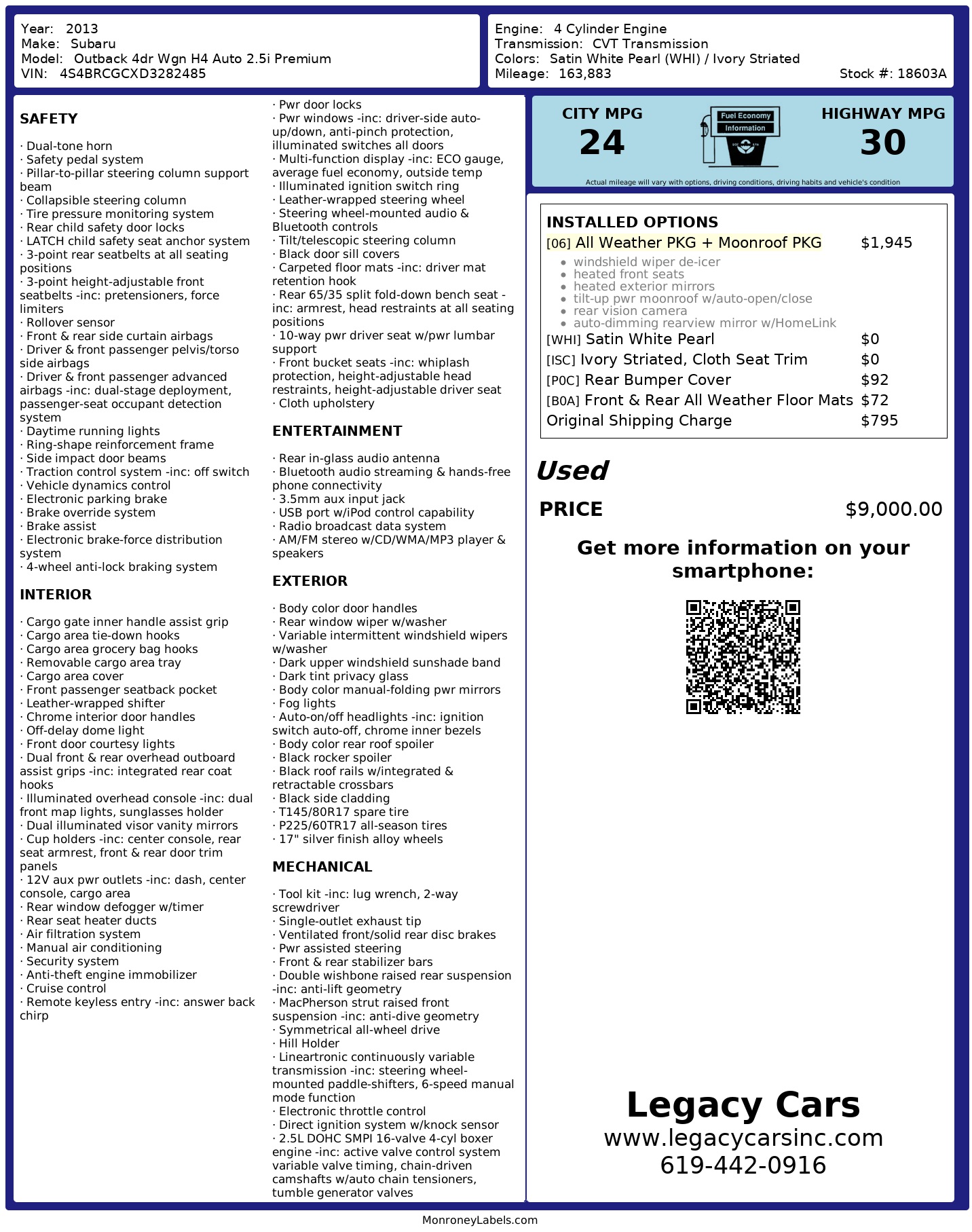 2013 Subaru Outback 4dr Wgn H4 Auto 2.5i Premium