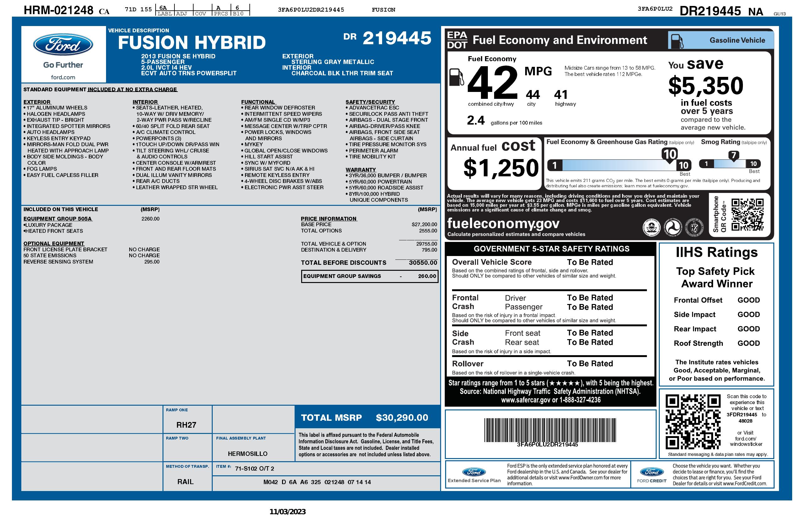 2013 Ford Fusion 4dr Sdn Se Hybrid Fwd
