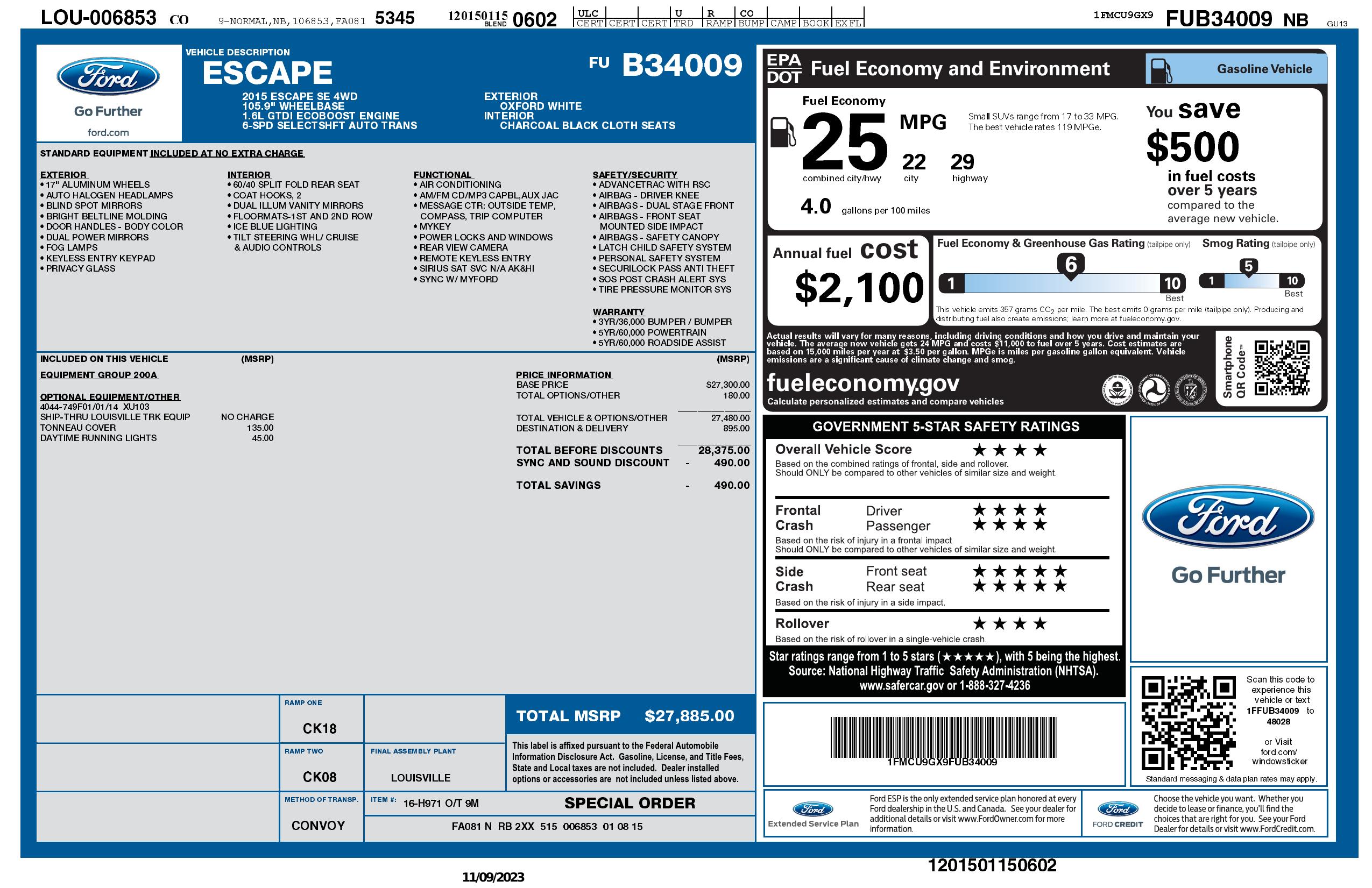 2015 Ford Escape 4 Wd 4dr Se