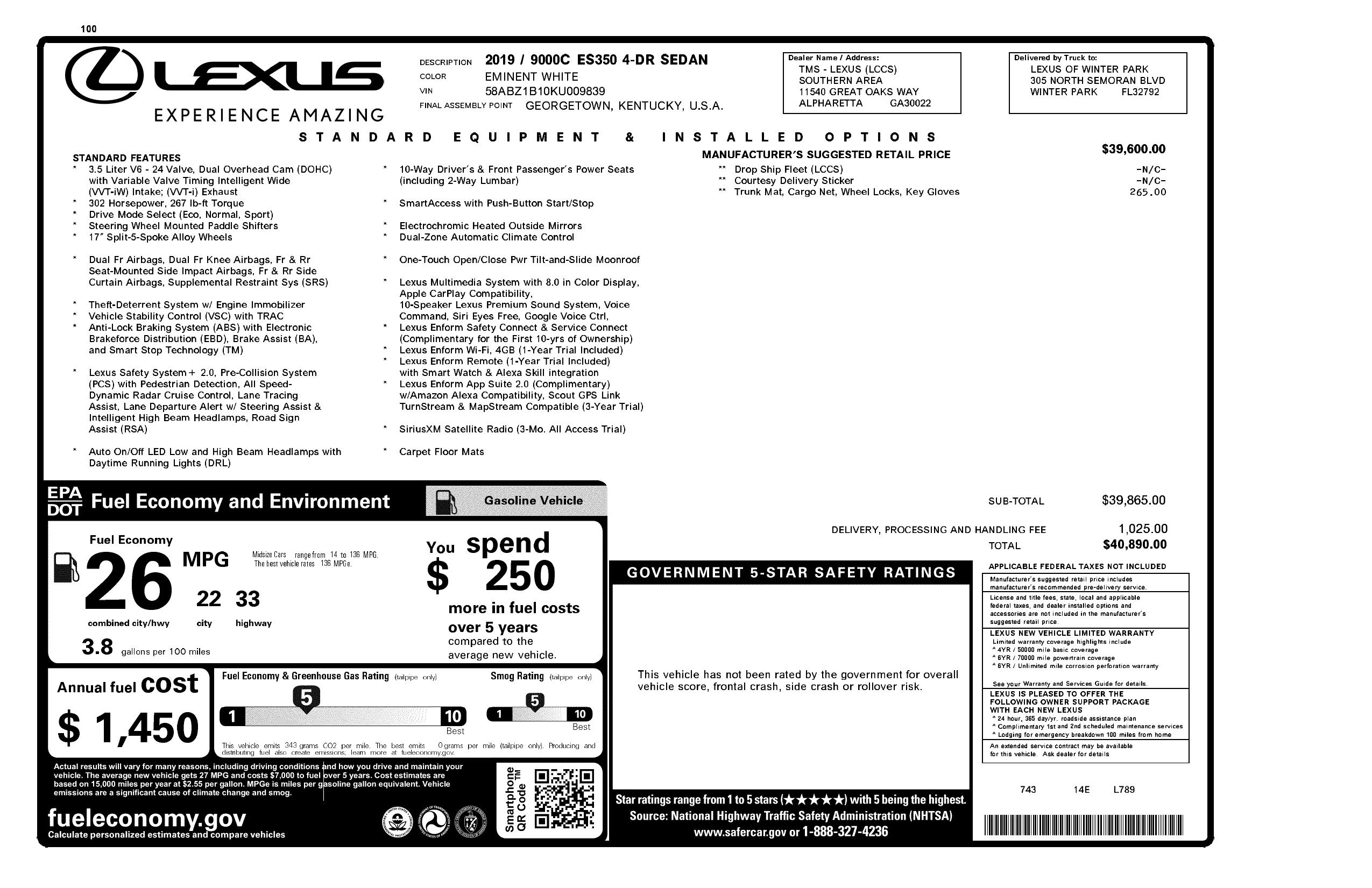 2019 Lexus Es Es 350 Fwd