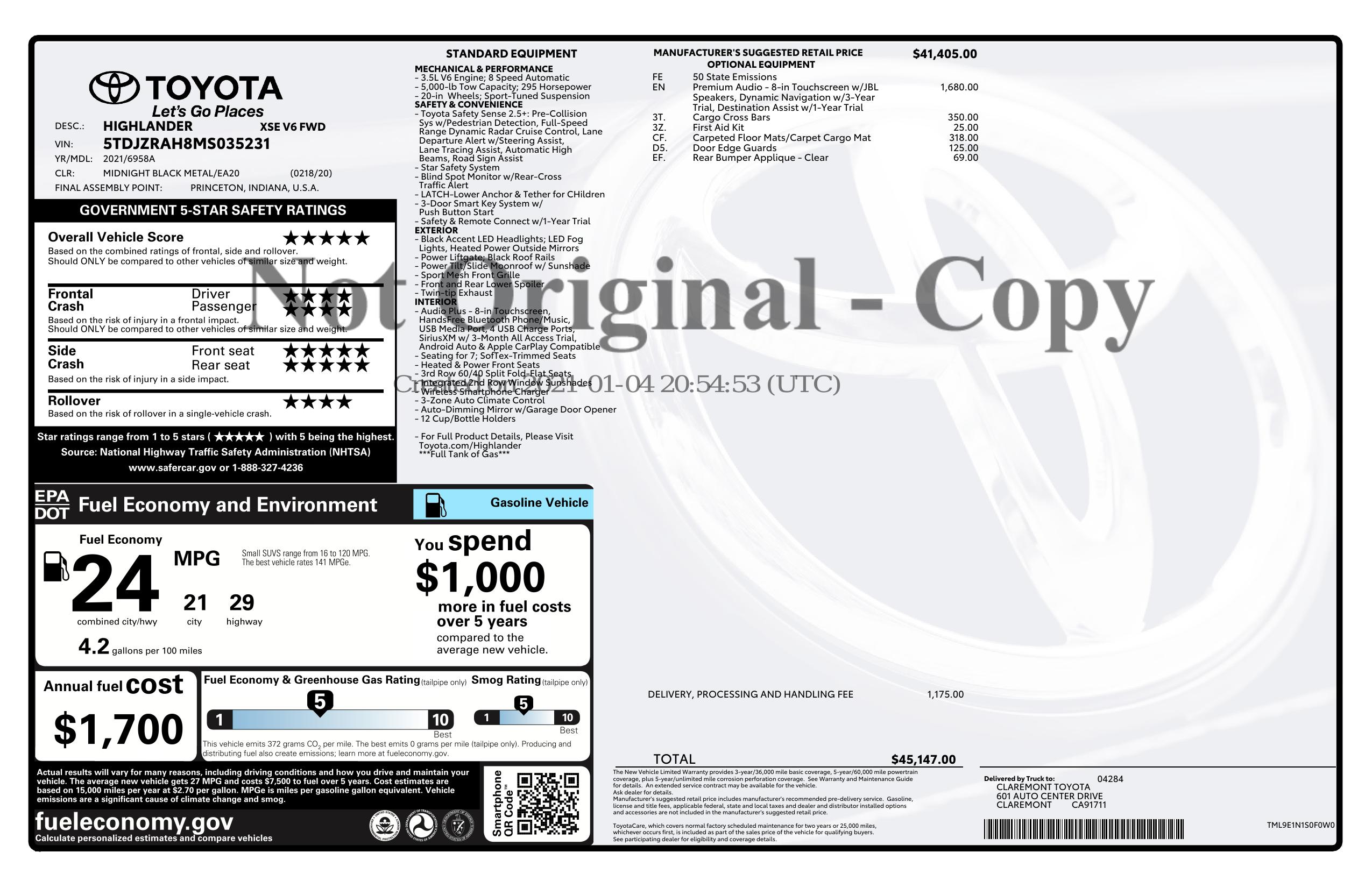 2021 Toyota Highlander Xse Fwd (Natl)