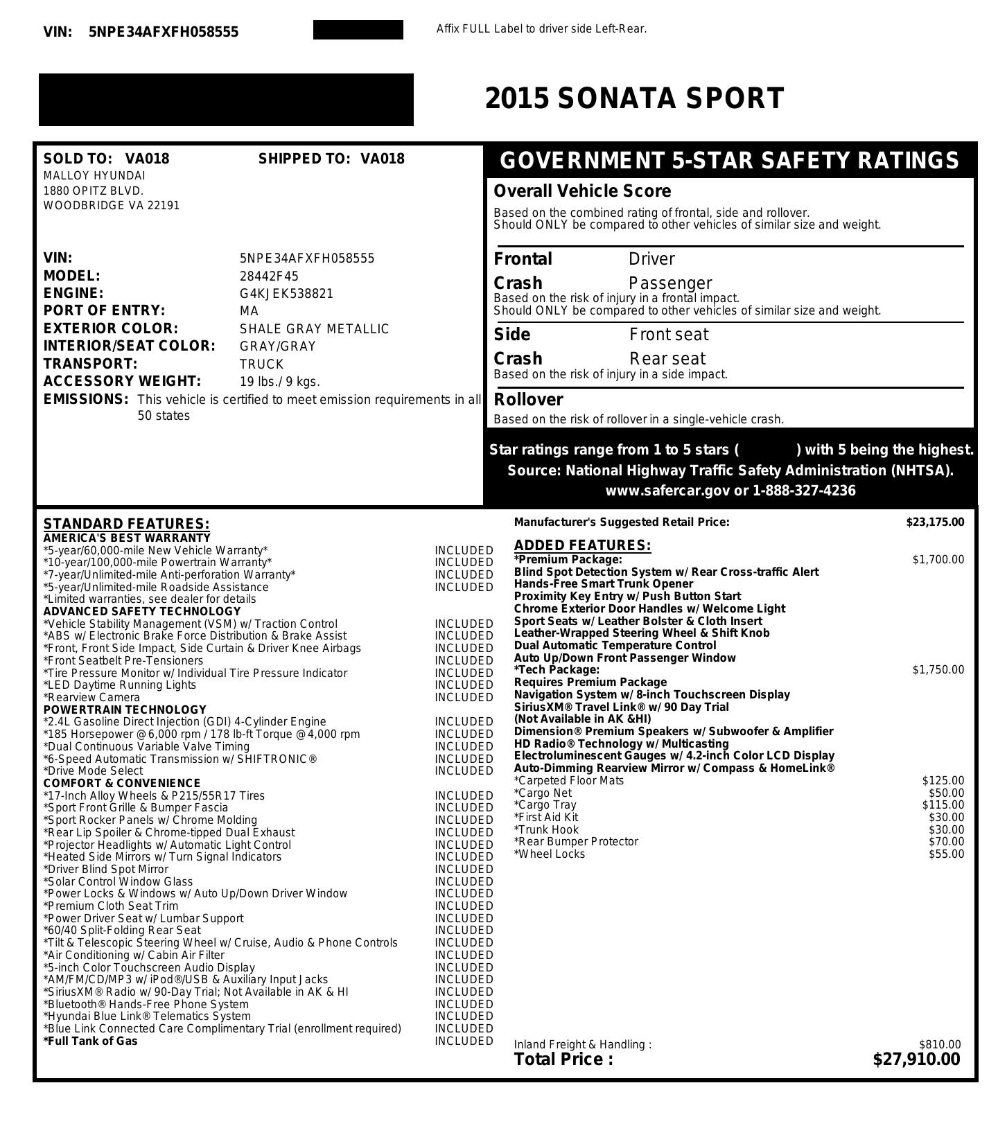 2015 Hyundai Sonata Sport 2.0 T Premium Tech Blind Spot Assist