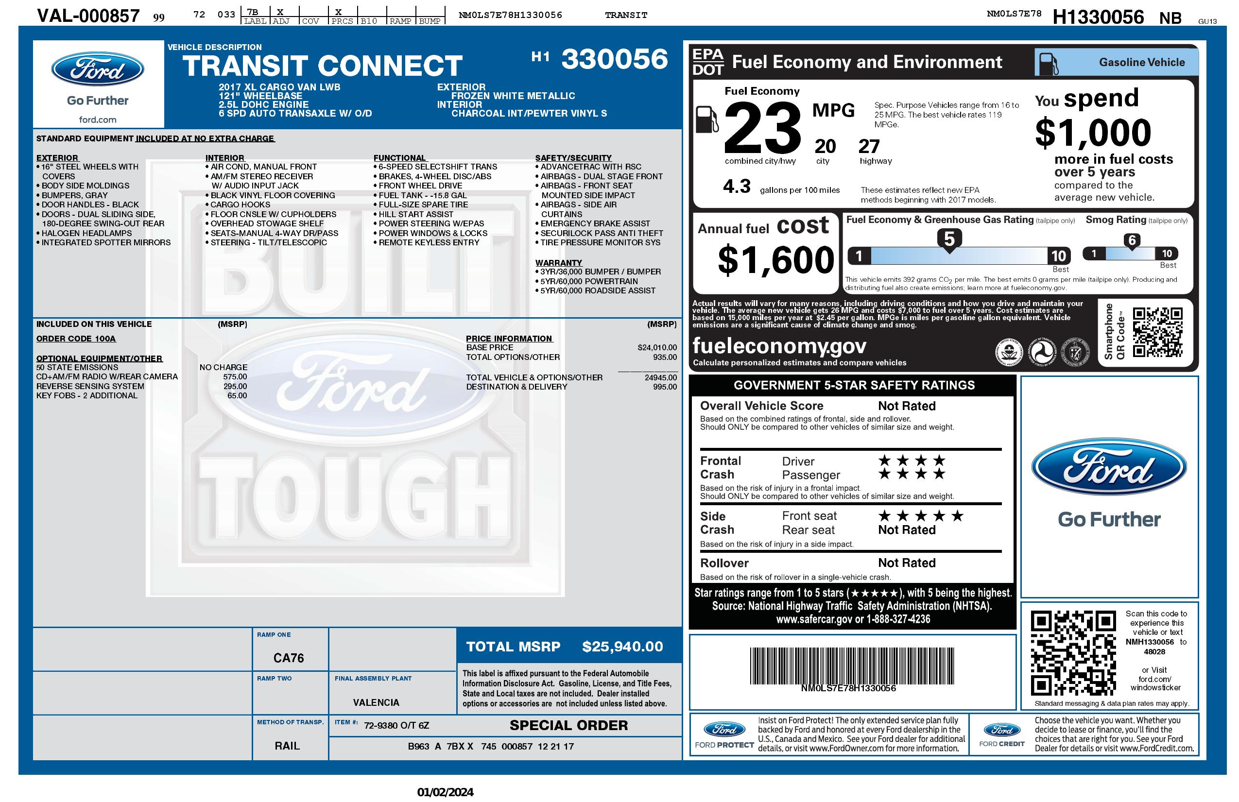 2017 Ford Transit Connect Van Xl Lwb W/Rear Symmetrical Doors