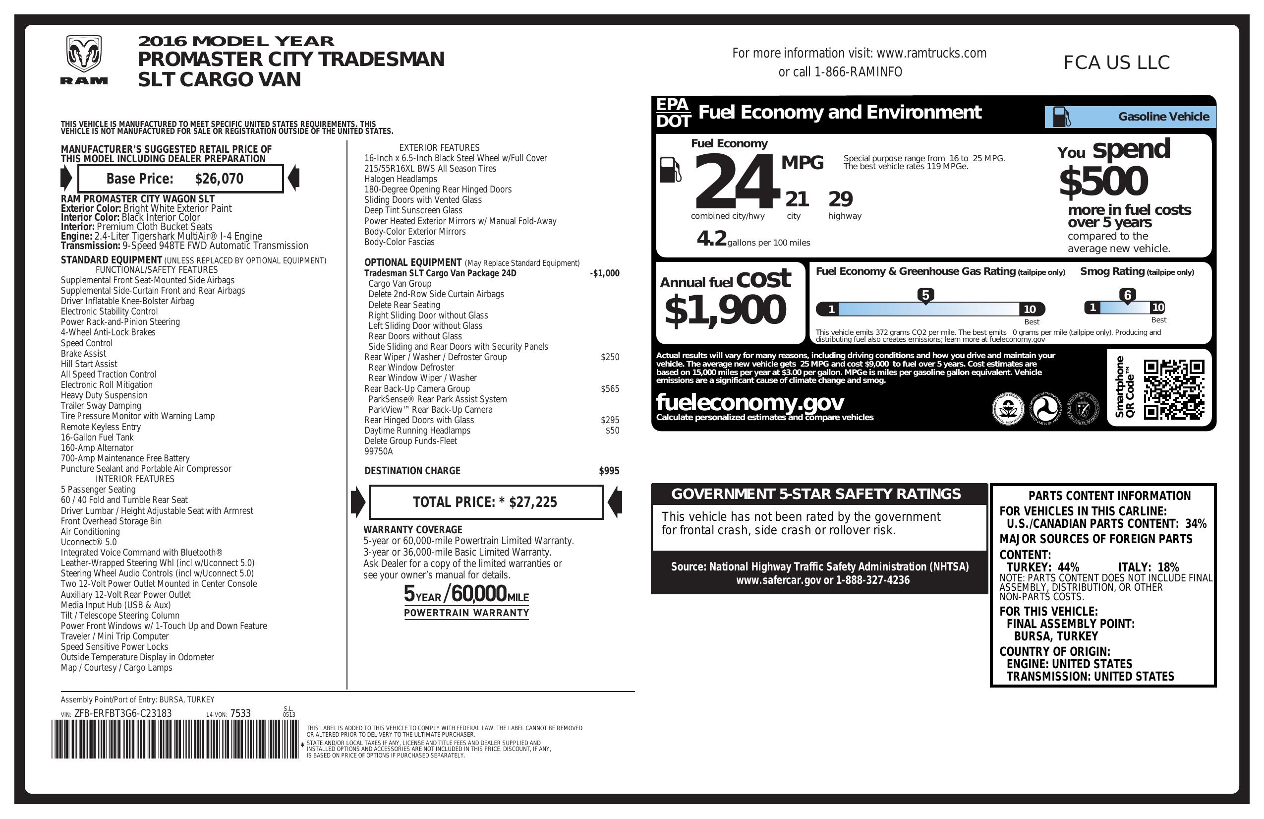 2016 Ram Pro Master City Cargo Van 122" Wb Tradesman Slt