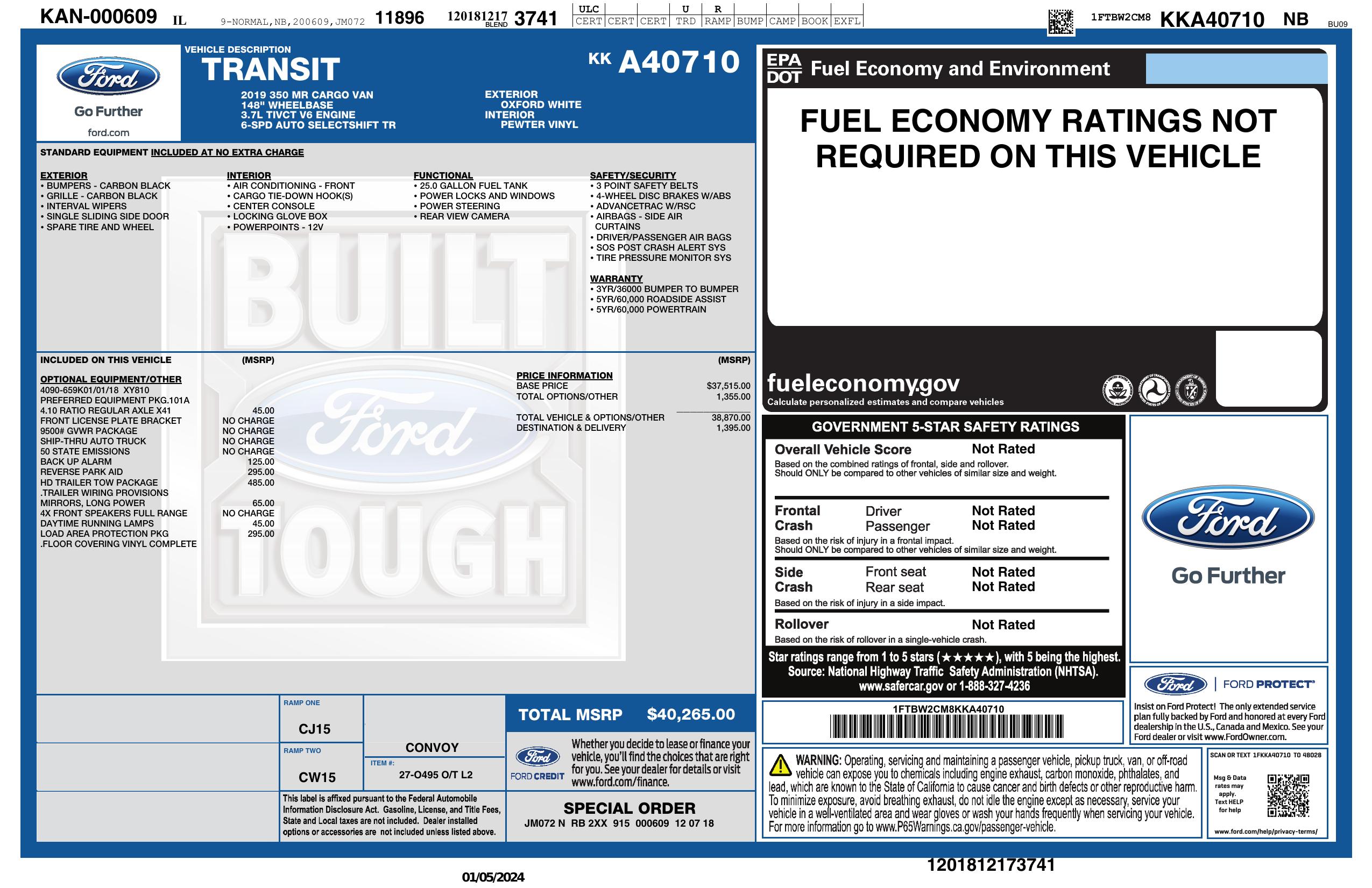 2019 Ford Transit Van T 350 148" Med Rf 9500 Gvwr Sliding Rh Dr