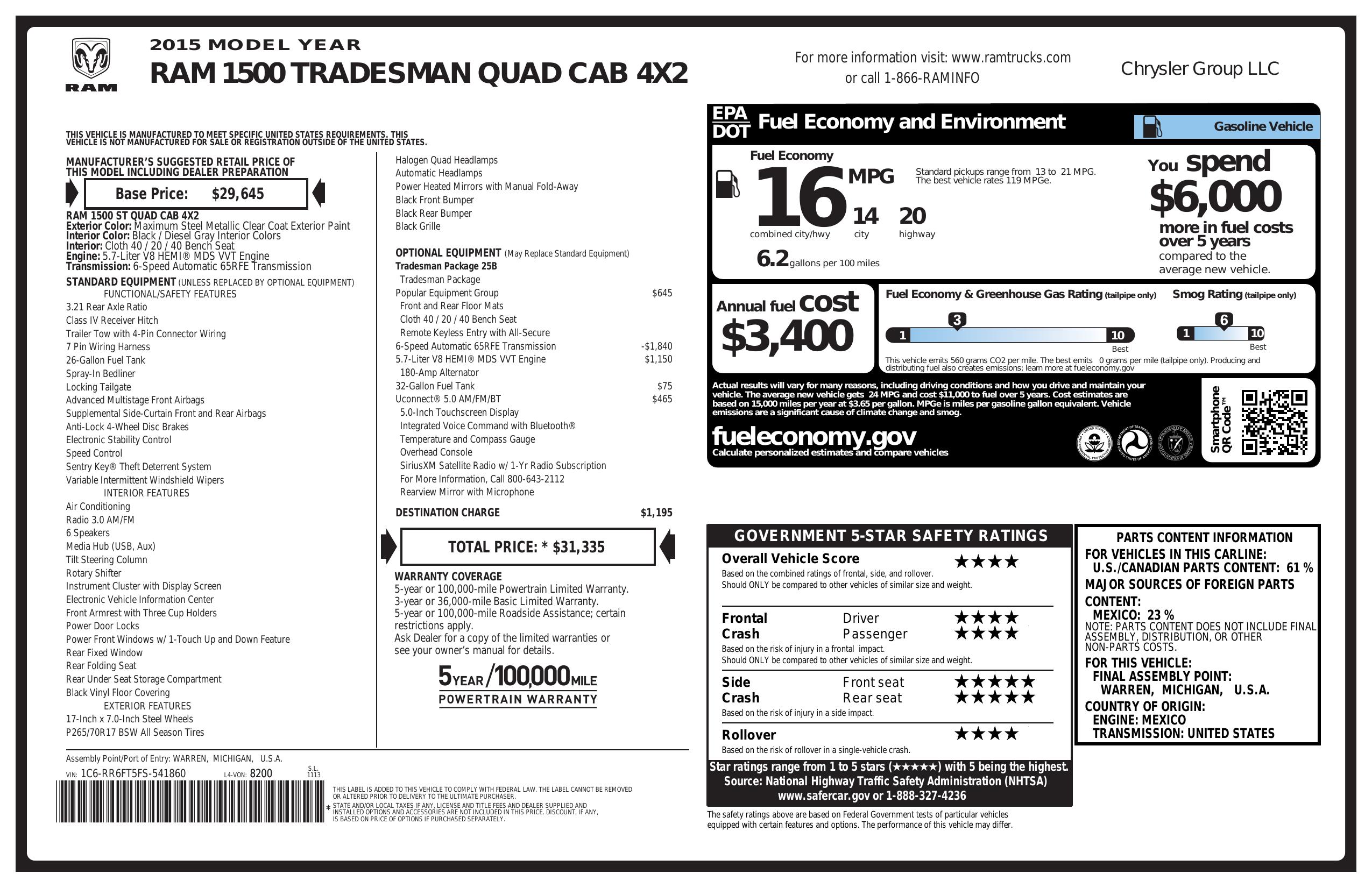 2015 Ram 1500 2 Wd Quad Cab 140.5" Tradesman