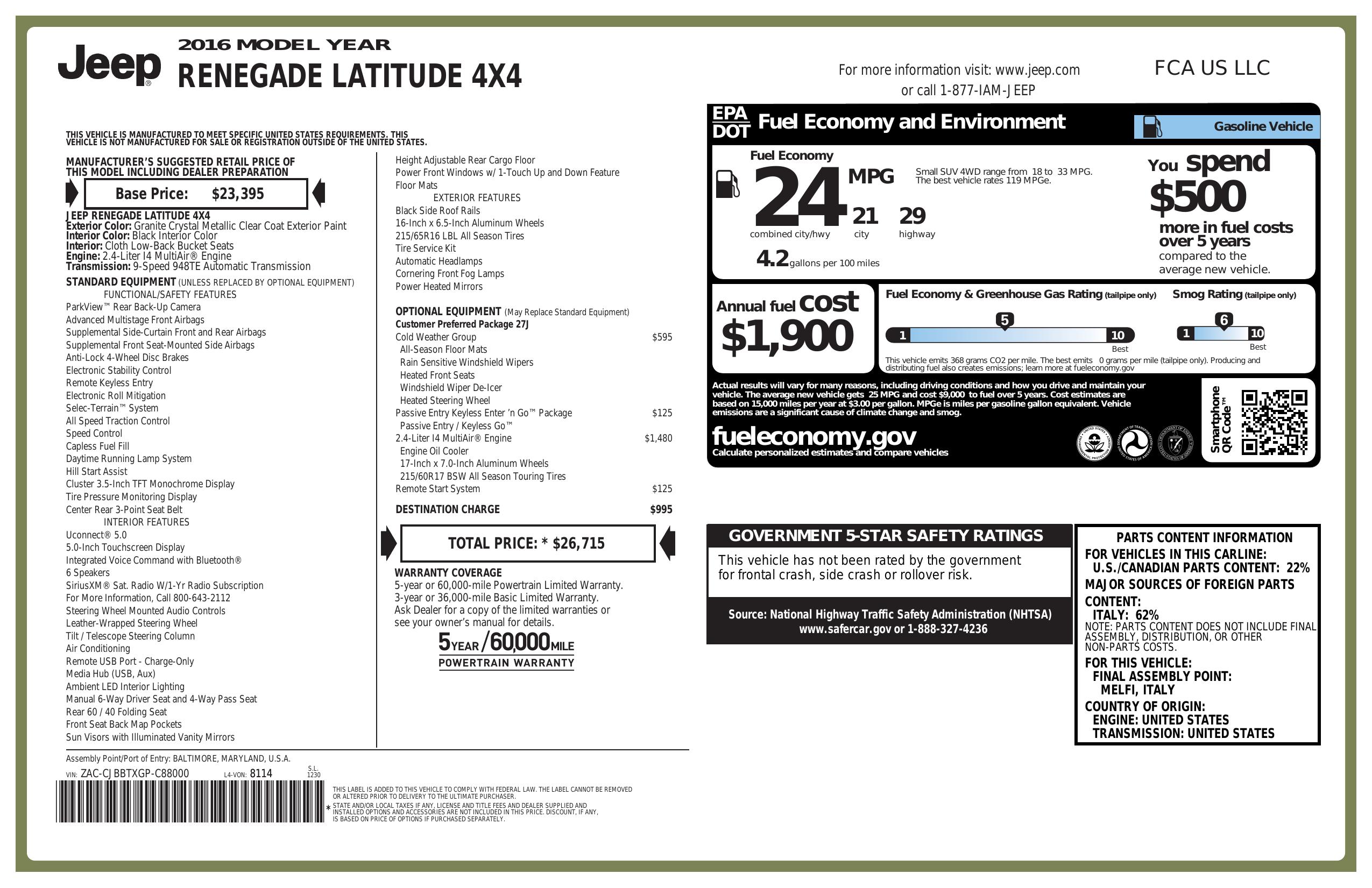 2016 Jeep Renegade 4 Wd 4dr Latitude