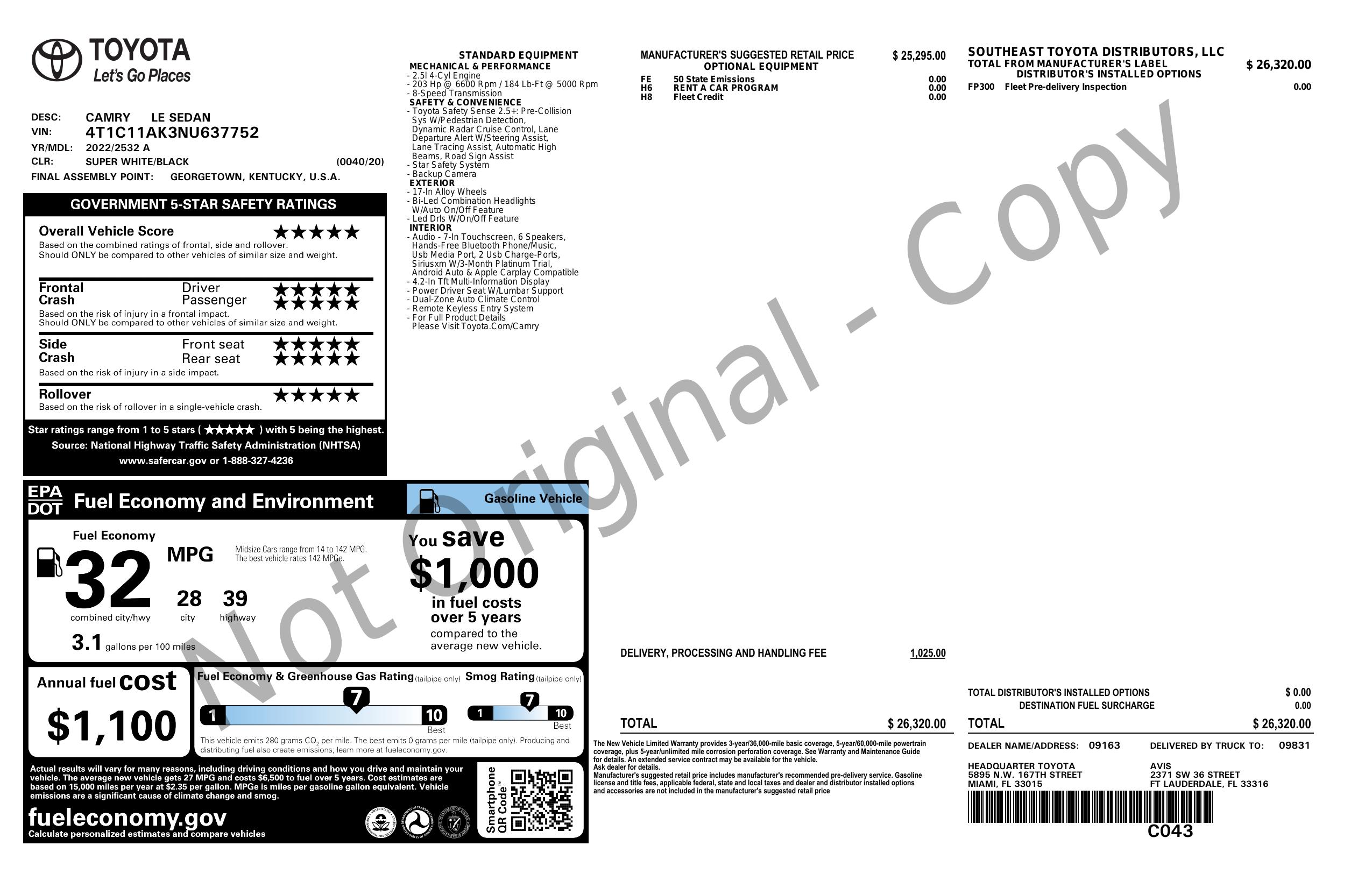 2022 Toyota Camry Le Auto (Natl)