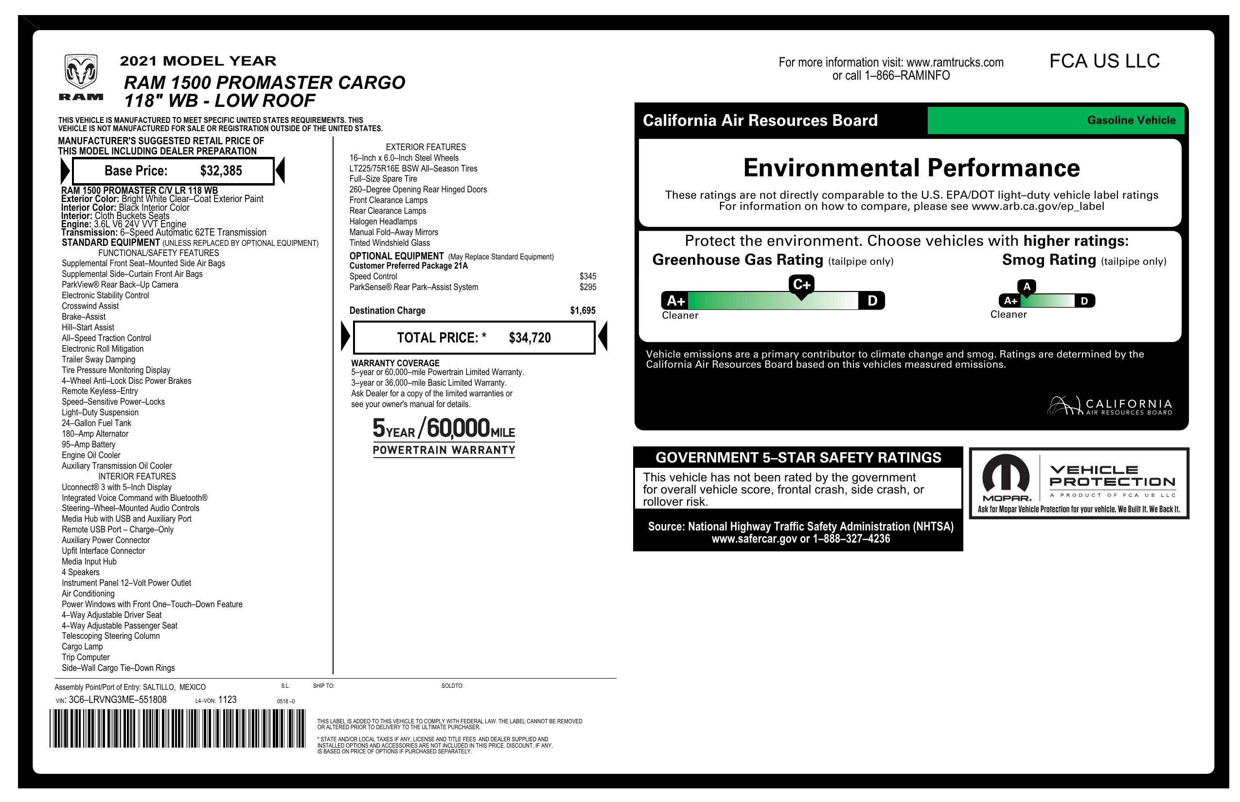 2021 Ram Pro Master Cargo Van 1500 Low Roof 118" Wb
