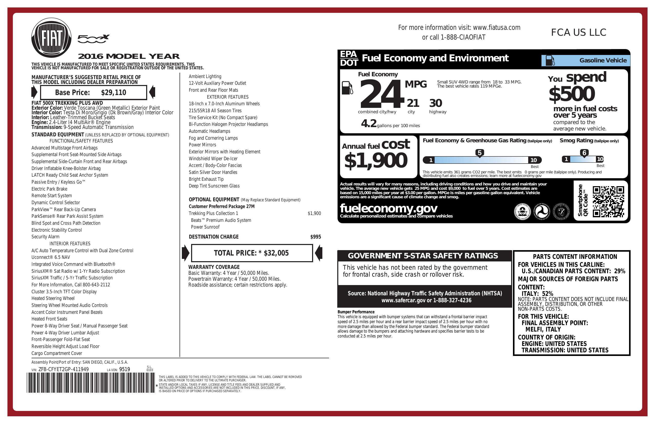 2016 Fiat 500 X Awd 4dr Trekking Plus