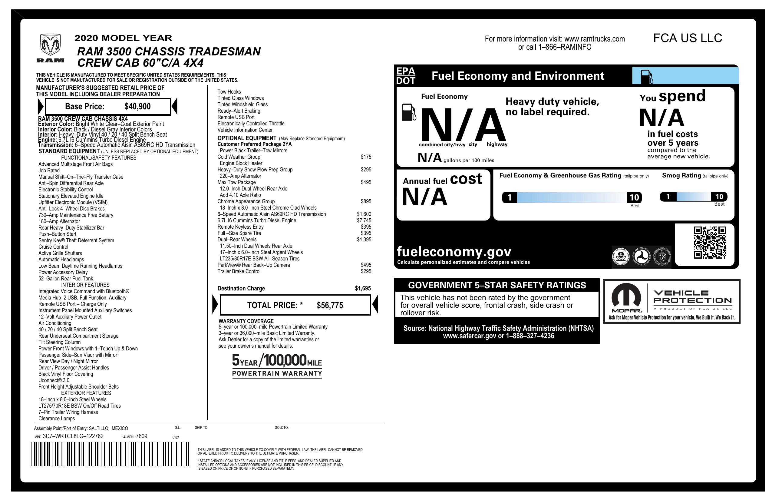 2020 Ram 3500 Chassis Cab Tradesman 4 Wd Crew Cab 60" Ca 172.4" Wb