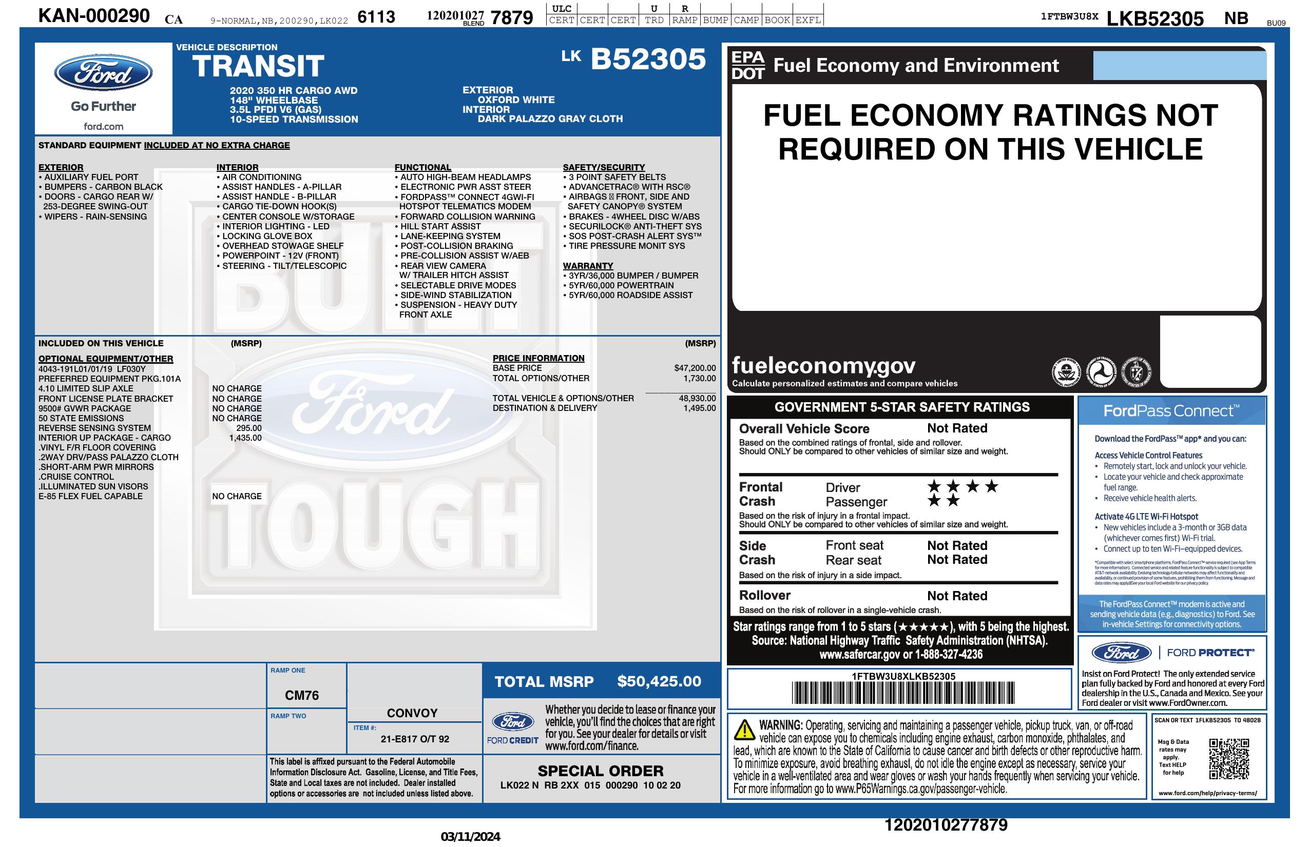 2020 Ford Transit Cargo Van T 350 148" El Hi Rf 9500 Gvwr Awd