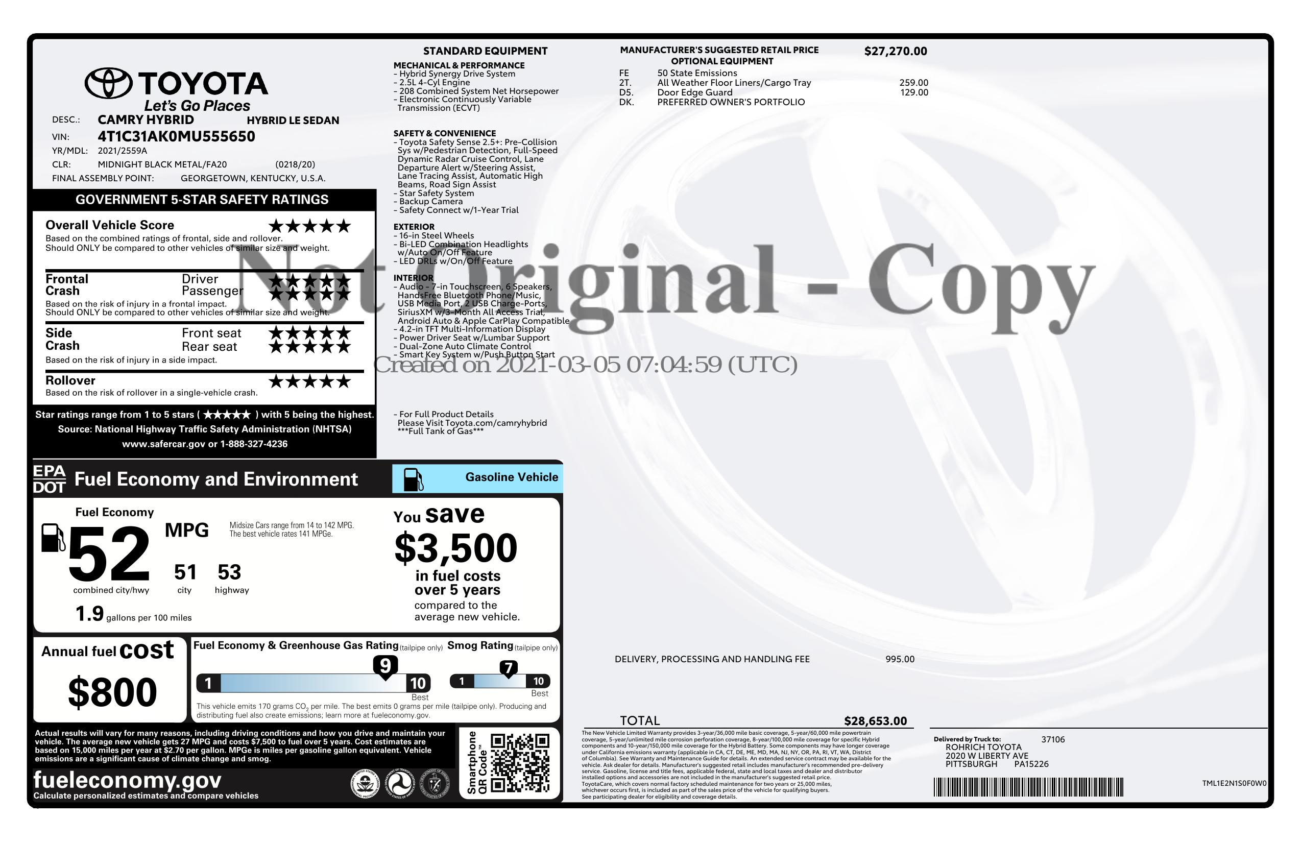 2021 Toyota Camry Hybrid Le Cvt (Natl)